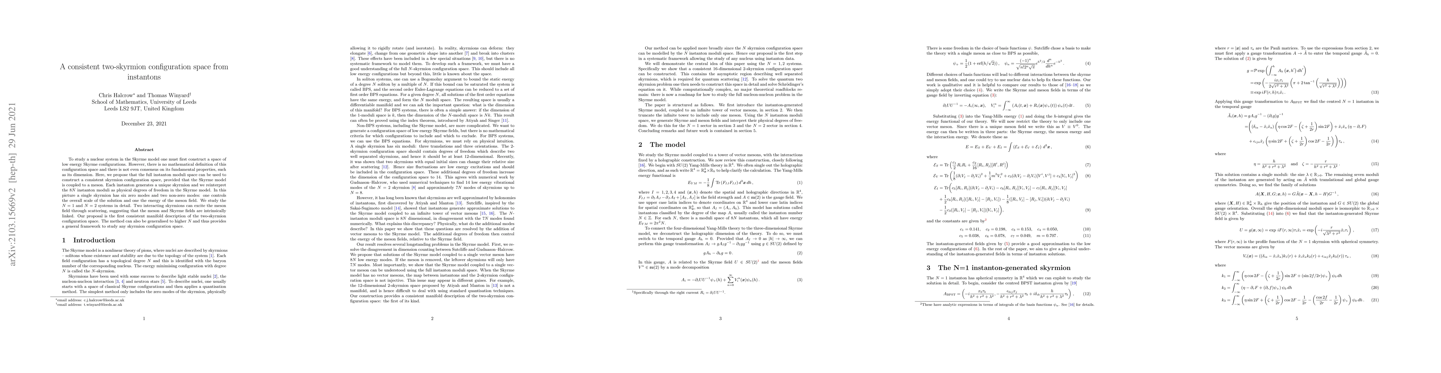 To study a nuclear system in the Skyrme model one must first construct a space of low energy Skyrme configurations. However, there is no mathematical definition of this configuration space and there is not even consensus on its fundamental properties, such as its dimension. Here, we propose that the full instanton moduli space can be used to construct a consistent skyrmion configuration space, provided that the Skyrme model is coupled to a meson. Each instanton generates a unique skyrmion and we reinterpret the $8N$ instanton moduli as physical degrees of freedom in the Skyrme model. In this picture a single skyrmion has six zero modes and two non-zero modes: one controls the overall scale of the solution and one the energy of the meson field. We study the $N=1$ and $N=2$ systems in detail. Two interacting skyrmions can excite the meson field through scattering, suggesting that the meson and Skyrme fields are intrinsically linked. Our proposal is the first consistent manifold description of the two-skyrmion configuration space. The method can also be generalised to higher $N$ and thus provides a general framework to study any skyrmion configuration space.