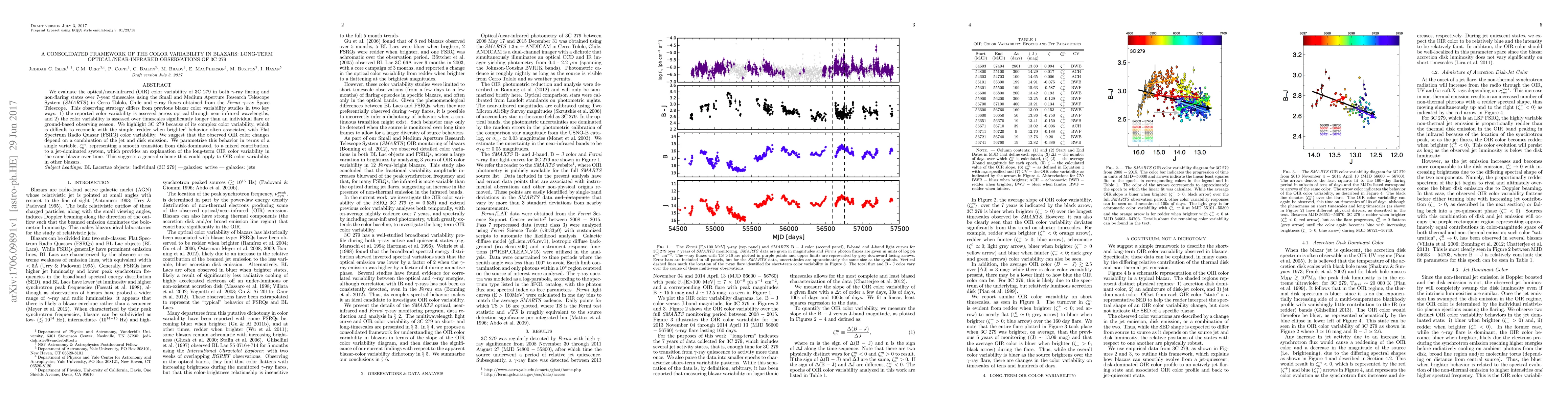 Researchers studied 3C 279 blazar over 7 years, finding its optical/near-infrared color variability depends on a combination of jet and disk emission, suggesting a general scheme for other blazars.