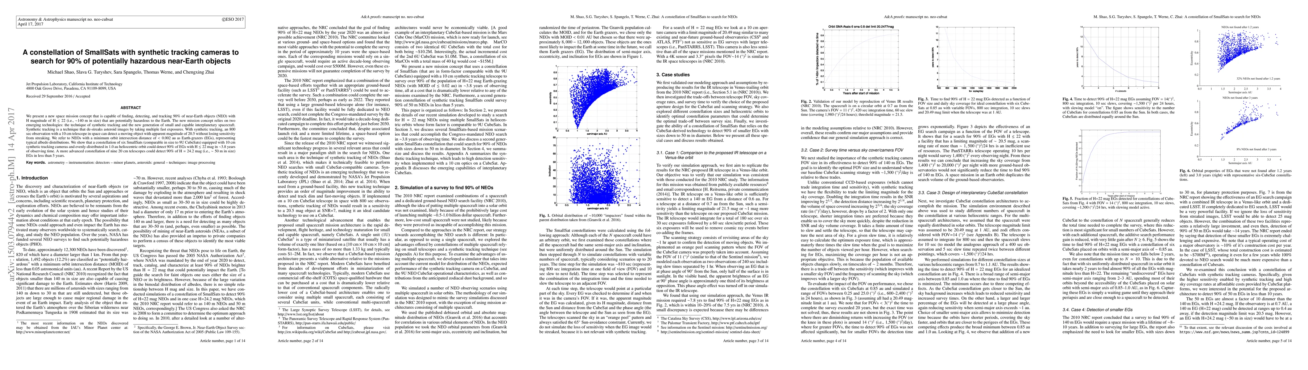A new space mission concept uses synthetic tracking cameras on CubeSats to detect 90% of near-Earth objects (NEOs) up to 140m in size within 3-5 years.