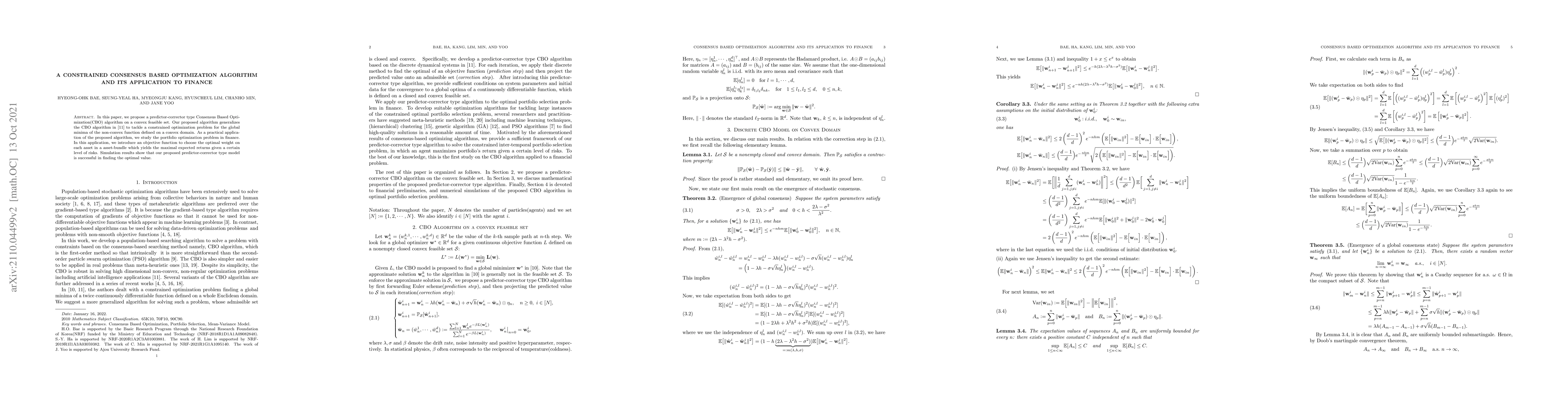 In this paper, we propose a predictor-corrector type Consensus Based Optimization (CBO) algorithm on a convex feasible set. Our proposed algorithm generalizes the CBO algorithm in [11] to tackle a constrained optimization problem for the global minima of the non-convex function defined on a convex domain. As a practical application of the proposed algorithm, we study the portfolio optimization problem in finance. In this application, we introduce an objective function to choose the optimal weight on each asset in a asset-bundle which yields the maximal expected returns given a certain level of risks. Simulation results show that our proposed predictor-corrector type model is successful in finding the optimal value.
