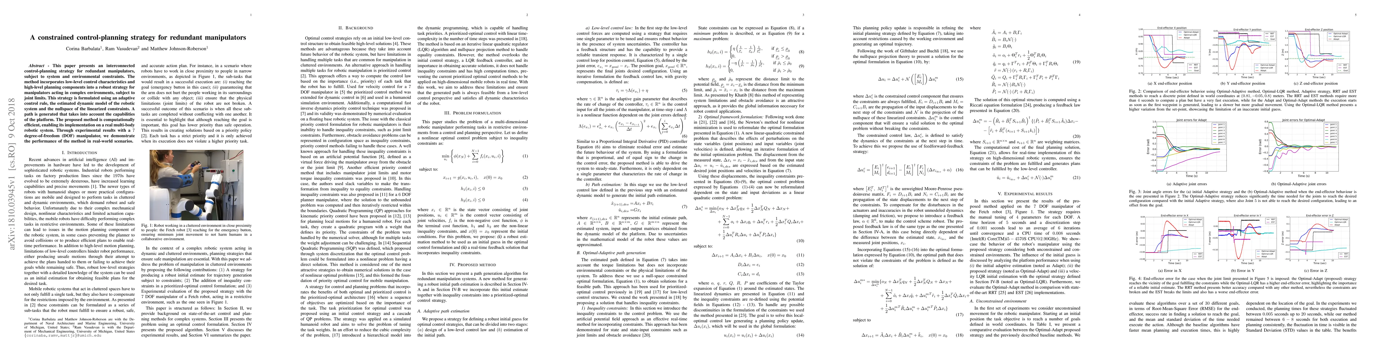This paper introduces a constrained control-planning strategy for redundant manipulators, integrating adaptive control and high-level planning to navigate complex environments while respecting joint limits. Experimental results on a 7 DOF manipulator validate the method's efficiency and effectiveness in real-world applications.
