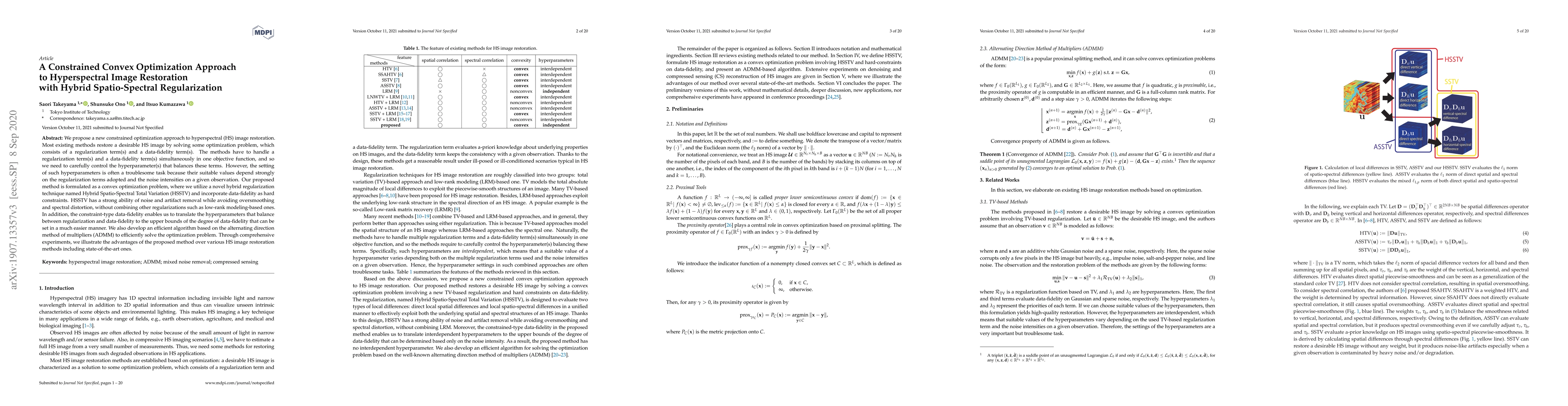 This paper proposes a constrained convex optimization approach for hyperspectral image restoration using a novel Hybrid Spatio-Spectral Total Variation (HSSTV) regularization technique. The method incorporates data-fidelity as hard constraints, simplifying hyperparameter tuning, and employs an efficient ADMM algorithm for optimization, demonstrating superior performance over existing methods.