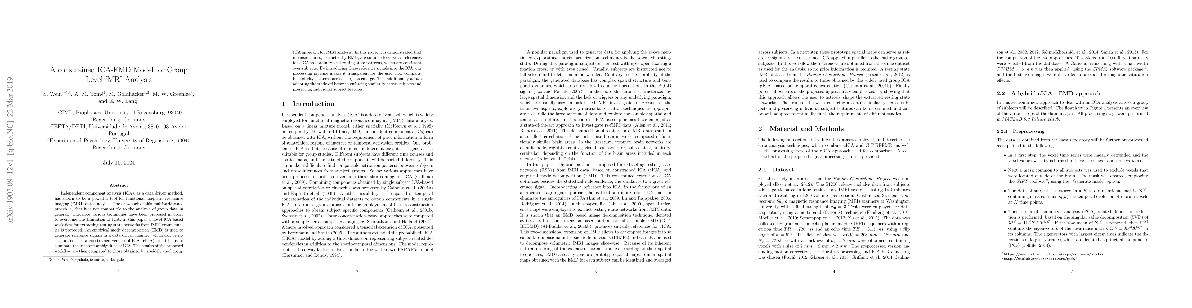 Independent component analysis (ICA), as a data driven method, has shown to be a powerful tool for functional magnetic resonance imaging (fMRI) data analysis. One drawback of this multivariate approach is, that it is not compatible to the analysis of group data in general. Therefore various techniques have been proposed in order to overcome this limitation of ICA. In this paper a novel ICA-based work-flow for extracting resting state networks from fMRI group studies is proposed. An empirical mode decomposition (EMD) is used to generate reference signals in a data driven manner, which can be incorporated into a constrained version of ICA (cICA), what helps to eliminate the inherent ambiguities of ICA. The results of the proposed workflow are then compared to those obtained by a widely used group ICA approach for fMRI analysis. In this paper it is demonstrated that intrinsic modes, extracted by EMD, are suitable to serve as references for cICA to obtain typical resting state patterns, which are consistent over subjects. By introducing these reference signals into the ICA, our processing pipeline makes it transparent for the user, how comparable activity patterns across subjects emerge. This additionally allows adapting the trade-off between enforcing similarity across subjects and preserving individual subject features.