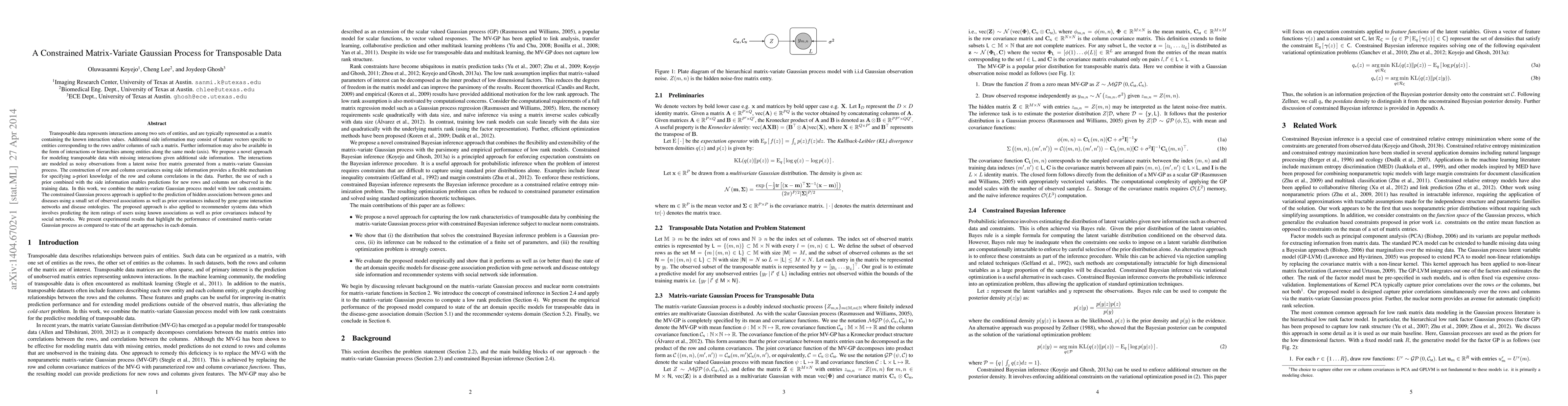 This paper proposes a constrained matrix-variate Gaussian process model for transposable data, incorporating side information to predict missing interactions. The model leverages prior knowledge from gene-gene interactions and disease ontologies, and is shown to outperform other methods in predicting gene-disease associations and recommender system ratings.
