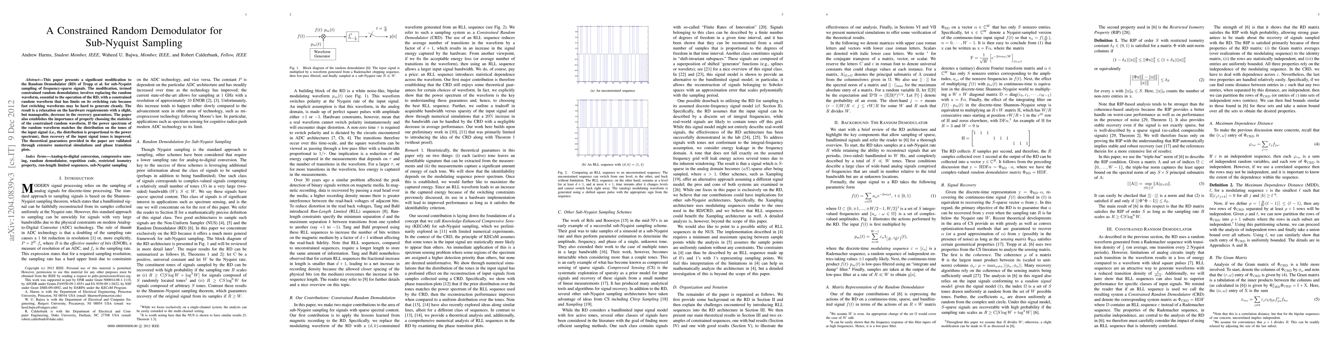 This paper presents a significant modification to the Random Demodulator (RD) of Tropp et al. for sub-Nyquist sampling of frequency-sparse signals. The modification, termed constrained random demodulator, involves replacing the random waveform, essential to the operation of the RD, with a constrained random waveform that has limits on its switching rate because fast switching waveforms may be hard to generate cleanly. The result is a relaxation on the hardware requirements with a slight, but manageable, decrease in the recovery guarantees. The paper also establishes the importance of properly choosing the statistics of the constrained random waveform. If the power spectrum of the random waveform matches the distribution on the tones of the input signal (i.e., the distribution is proportional to the power spectrum), then recovery of the input signal tones is improved. The theoretical guarantees provided in the paper are validated through extensive numerical simulations and phase transition plots.