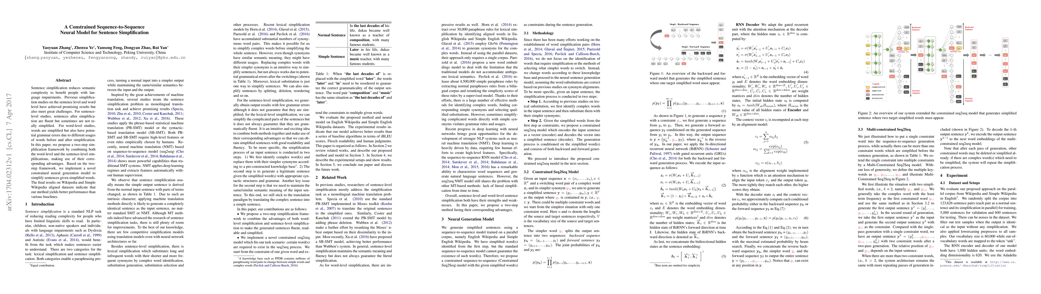 This paper proposes a two-step framework for sentence simplification that combines word-level and sentence-level approaches to address their respective challenges. The authors implement a constrained sequence-to-sequence neural model that simplifies sentences using simplified words, achieving better performance than baseline methods on Wikipedia datasets.
