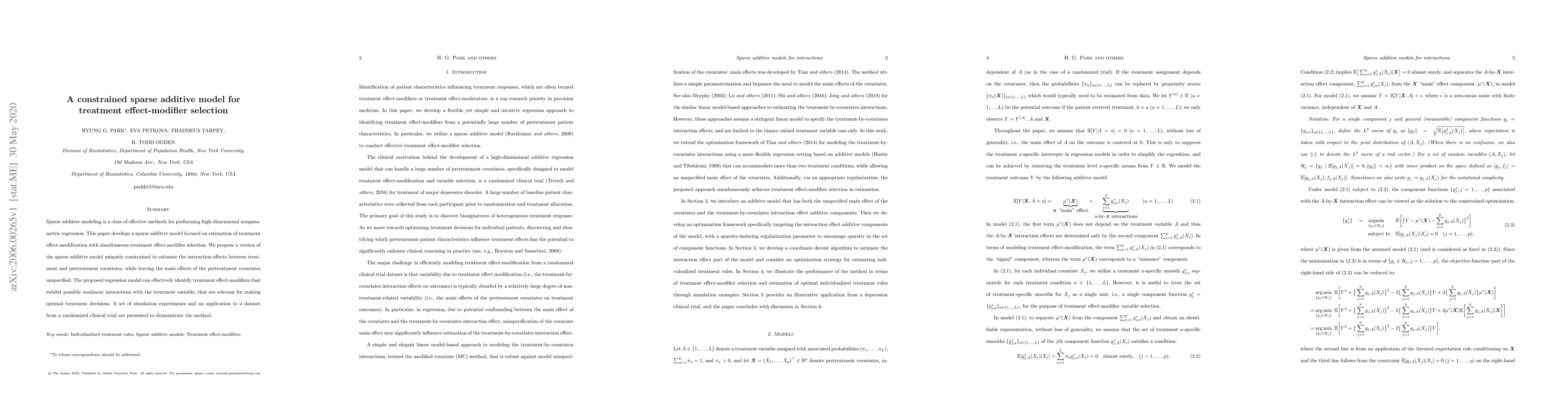 This paper proposes a constrained sparse additive model to estimate and select treatment effect-modifiers, focusing on the interaction between treatment and pretreatment covariates while ignoring main effects. The method is demonstrated through simulations and an application to a clinical trial dataset.