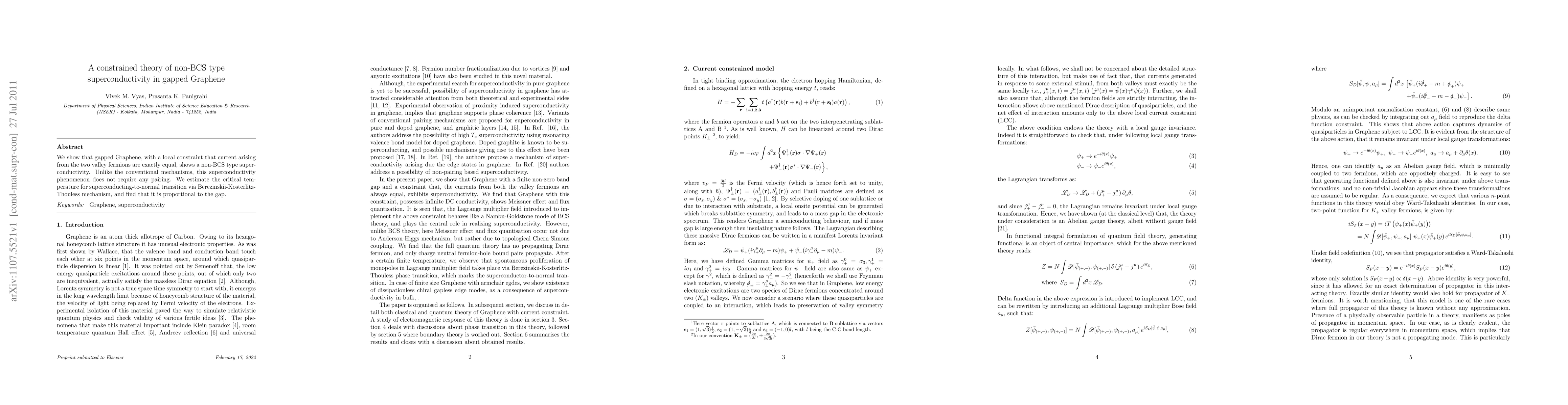 This research proposes a novel, constraint-based theory for non-BCS type superconductivity in gapped Graphene, independent of pairing. It estimates critical temperature using Berezinskii-Kosterlitz-Thouless mechanism, finding it directly proportional to the gap.