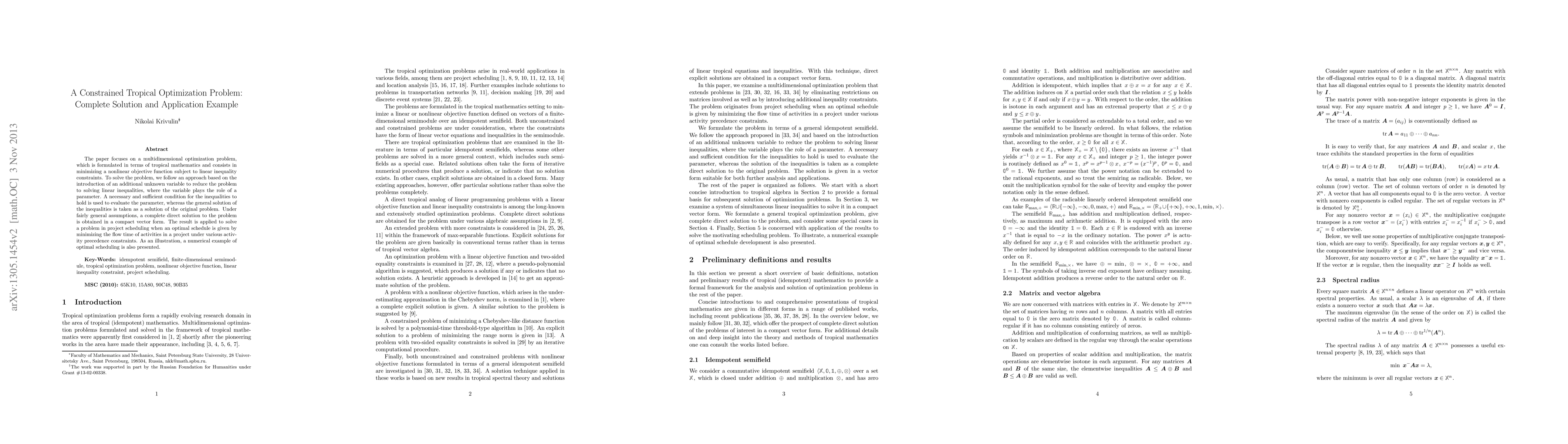The paper focuses on a multidimensional optimization problem, which is formulated in terms of tropical mathematics and consists in minimizing a nonlinear objective function subject to linear inequality constraints. To solve the problem, we follow an approach based on the introduction of an additional unknown variable to reduce the problem to solving linear inequalities, where the variable plays the role of a parameter. A necessary and sufficient condition for the inequalities to hold is used to evaluate the parameter, whereas the general solution of the inequalities is taken as a solution of the original problem. Under fairly general assumptions, a complete direct solution to the problem is obtained in a compact vector form. The result is applied to solve a problem in project scheduling when an optimal schedule is given by minimizing the flow time of activities in a project under various activity precedence constraints. As an illustration, a numerical example of optimal scheduling is also presented.