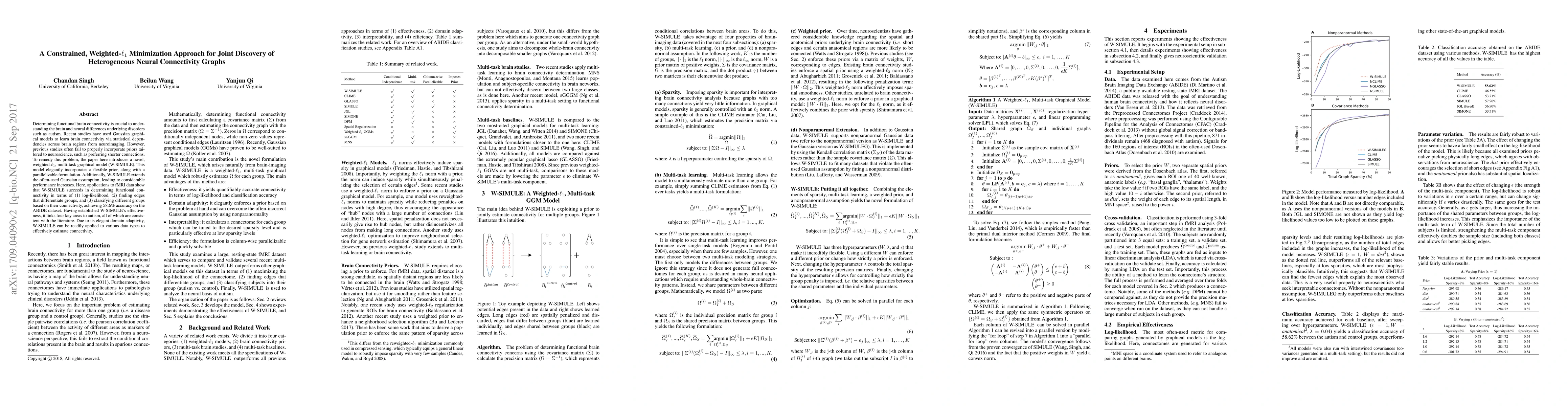 Determining functional brain connectivity is crucial to understanding the brain and neural differences underlying disorders such as autism. Recent studies have used Gaussian graphical models to learn brain connectivity via statistical dependencies across brain regions from neuroimaging. However, previous studies often fail to properly incorporate priors tailored to neuroscience, such as preferring shorter connections. To remedy this problem, the paper here introduces a novel, weighted-$\ell_1$, multi-task graphical model (W-SIMULE). This model elegantly incorporates a flexible prior, along with a parallelizable formulation. Additionally, W-SIMULE extends the often-used Gaussian assumption, leading to considerable performance increases. Here, applications to fMRI data show that W-SIMULE succeeds in determining functional connectivity in terms of (1) log-likelihood, (2) finding edges that differentiate groups, and (3) classifying different groups based on their connectivity, achieving 58.6\% accuracy on the ABIDE dataset. Having established W-SIMULE's effectiveness, it links four key areas to autism, all of which are consistent with the literature. Due to its elegant domain adaptivity, W-SIMULE can be readily applied to various data types to effectively estimate connectivity.