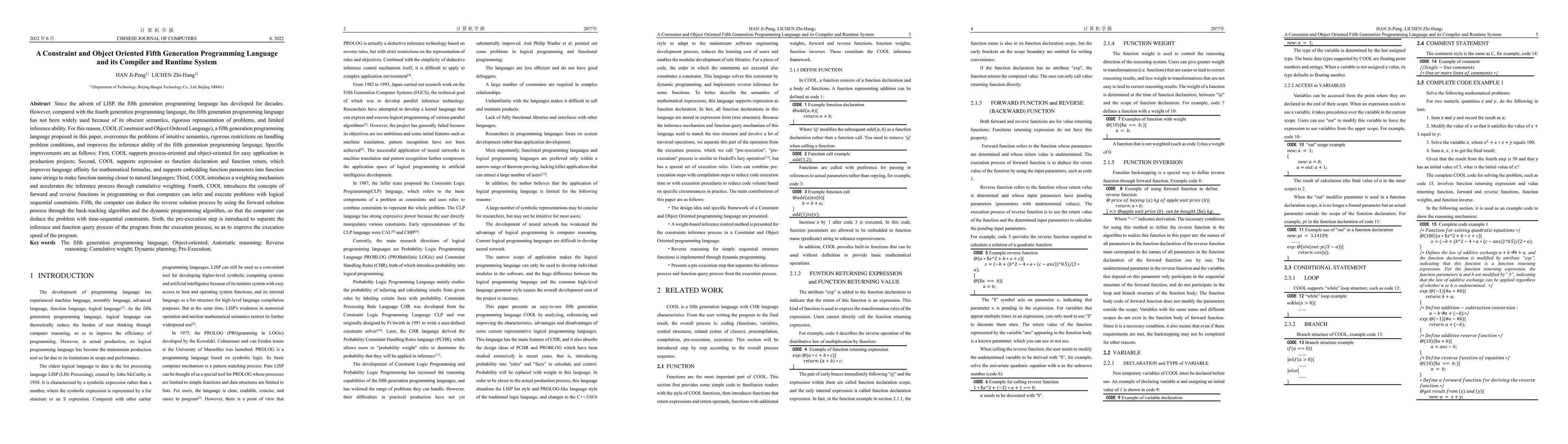 Since the advent of LISP, the fifth generation programming language has developed for decades. However, compared with the fourth generation programming language, the fifth generation programming language has not been widely used because of its obscure semantics, rigorous representation of problems, and limited inference ability. For this reason, COOL (Constraint and Object Ordered Language), a fifth generation programming language proposed in this paper, overcomes the problems of intuitive semantics, rigorous restrictions on handling problem conditions, and improves the inference ability of previous fifth generation programming languages. Specific improvements are as follows: First, COOL supports process-oriented and object-oriented for easy application in production projects; Second, COOL supports expression as function declaration and function return, which improves language affinity for mathematical formulas, and supports embedding function parameters into function name strings to make function naming closer to natural languages. Make mathematical problems easier to describe; Third, COOL introduces a weighting mechanism and accelerates the inference process through cumulative weighting. Fourth, COOL introduces the concepts of forward and reverse functions in programming so that computers can infer and execute problems with logical sequential constraints. Fifth, the computer can deduce the reverse solution process by using the forward solution process through the back-tracking algorithm and the dynamic programming algorithm, so that the computer can deduce the problem with time-sequential constraints. Sixth, the pre-execution step is introduced to separate the inference and function query process of the program from the execution process, so as to improve the execution speed of the program.
