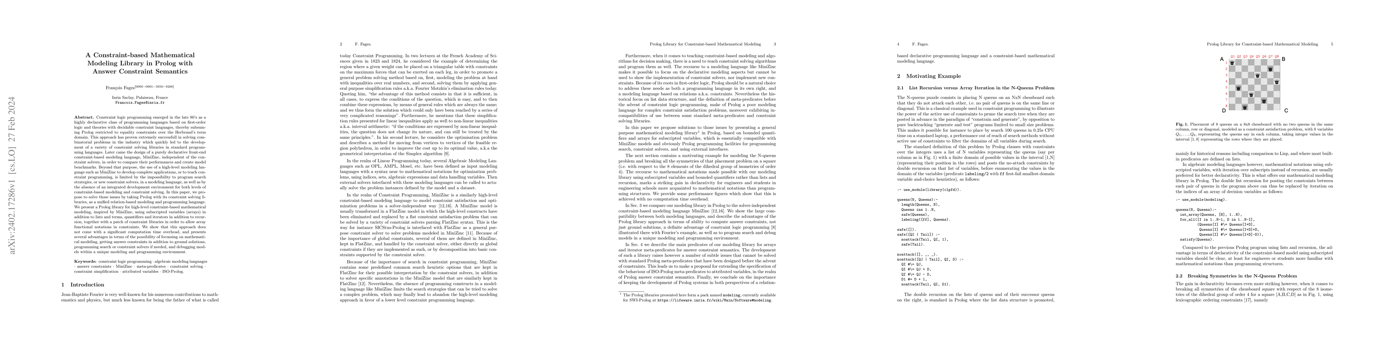 This paper introduces a Prolog library for constraint-based mathematical modeling inspired by MiniZinc, enabling high-level modeling with arrays, quantifiers, and iterators. It demonstrates that this approach offers advantages in modeling focus, answer constraints, and integrated development without significant computation overhead.