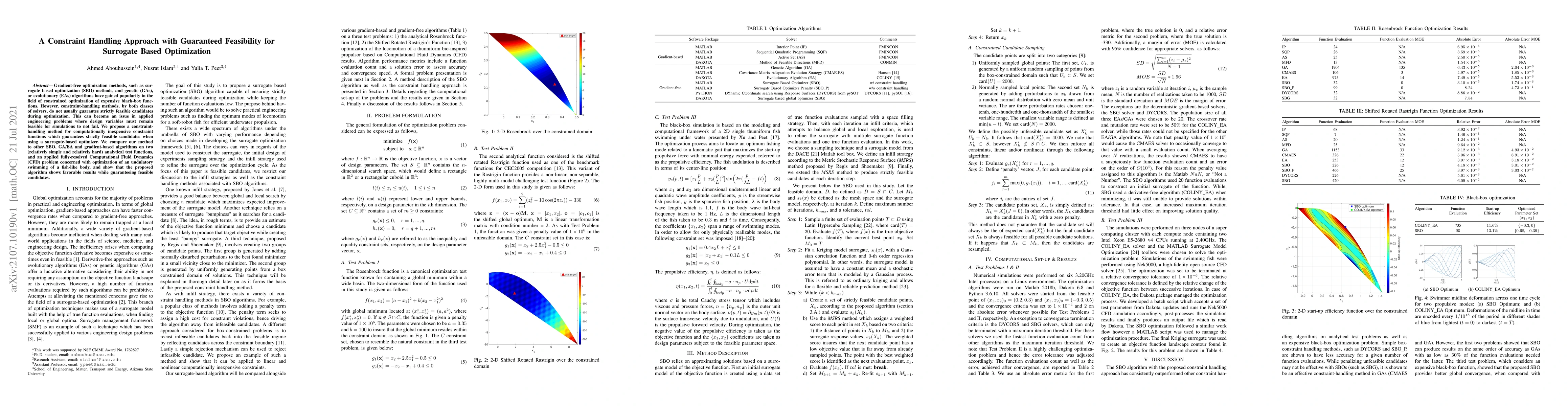Gradient-free optimization methods, such as surrogate based optimization (SBO) methods, and genetic (GAs), or evolutionary (EAs) algorithms have gained popularity in the field of constrained optimization of expensive black-box functions. However, constraint-handling methods, by both classes of solvers, do not usually guarantee strictly feasible candidates during optimization. This can become an issue in applied engineering problems where design variables must remain feasible for simulations to not fail. We propose a constraint-handling method for computationally inexpensive constraint functions which guarantees strictly feasible candidates when using a surrogate-based optimizer. We compare our method to other SBO, GA/EA and gradient-based algorithms on two (relatively simple and relatively hard) analytical test functions, and an applied fully-resolved Computational Fluid Dynamics (CFD) problem concerned with optimization of an undulatory swimming of a fish-like body, and show that the proposed algorithm shows favorable results while guaranteeing feasible candidates.