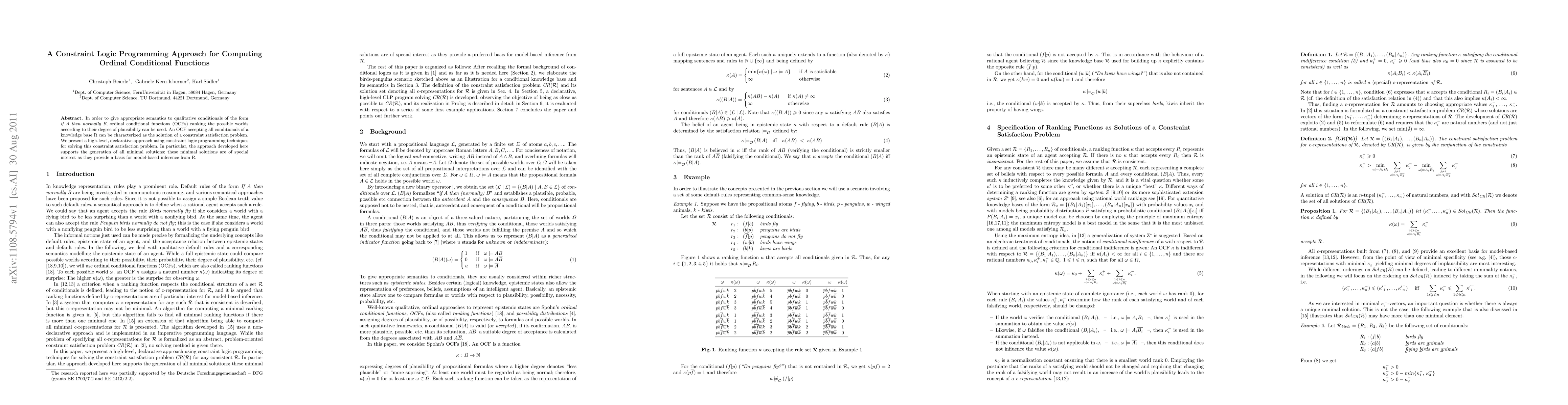 This paper proposes a constraint logic programming method to compute ordinal conditional functions (OCFs) that rank possible worlds by plausibility for qualitative conditionals. The approach generates minimal solutions, which are crucial for model-based inference from the knowledge base.