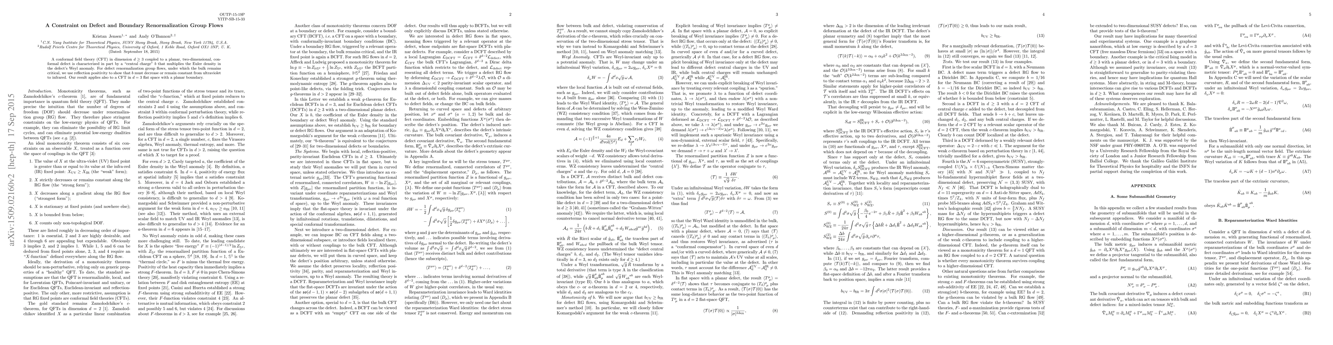 A conformal field theory (CFT) in dimension $d\geq 3$ coupled to a planar, two-dimensional, conformal defect is characterized in part by a "central charge" $b$ that multiplies the Euler density in the defect's Weyl anomaly. For defect renormalization group flows, under which the bulk remains critical, we use reflection positivity to show that $b$ must decrease or remain constant from ultraviolet to infrared. Our result applies also to a CFT in $d=3$ flat space with a planar boundary.