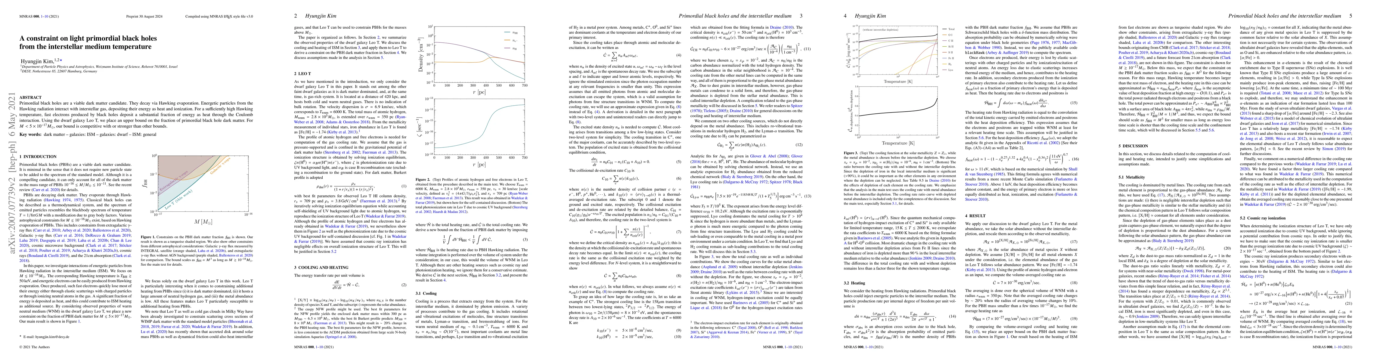This paper constrains the abundance of light primordial black holes as dark matter by analyzing their Hawking radiation's impact on the interstellar medium temperature in the dwarf galaxy Leo T. It finds that for black holes below $5 \times 10^{-17} M_\odot$, the resulting heat deposition sets a competitive upper limit on their contribution to dark matter.