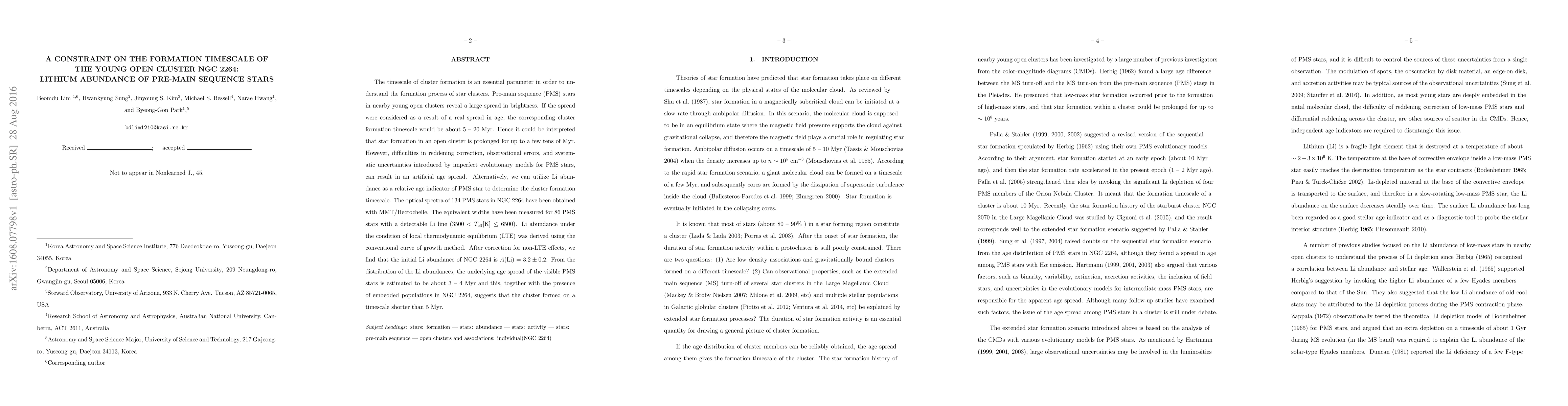 The timescale of cluster formation is an essential parameter in order to understand the formation process of star clusters. Pre-main sequence (PMS) stars in nearby young open clusters reveal a large spread in brightness. If the spread were considered as a result of a real spread in age, the corresponding cluster formation timescale would be about 5 -- 20 Myr. Hence it could be interpreted that star formation in an open cluster is prolonged for up to a few tens of Myr. However, difficulties in reddening correction, observational errors, and systematic uncertainties introduced by imperfect evolutionary models for PMS stars, can result in an artificial age spread. Alternatively, we can utilize Li abundance as a relative age indicator of PMS star to determine the cluster formation timescale. The optical spectra of 134 PMS stars in NGC 2264 have been obtained with MMT/Hectochelle. The equivalent widths have been measured for 86 PMS stars with a detectable Li line (3500 < T_eff [K] <= 6500). Li abundance under the condition of local thermodynamic equilibrium (LTE) was derived using the conventional curve of growth method. After correction for non-LTE effects, we find that the initial Li abundance of NGC 2264 is A(Li) = 3.2 +/- 0.2. From the distribution of the Li abundances, the underlying age spread of the visible PMS stars is estimated to be about 3 -- 4 Myr and this, together with the presence of embedded populations in NGC 2264, suggests that the cluster formed on a timescale shorter than 5 Myr.
