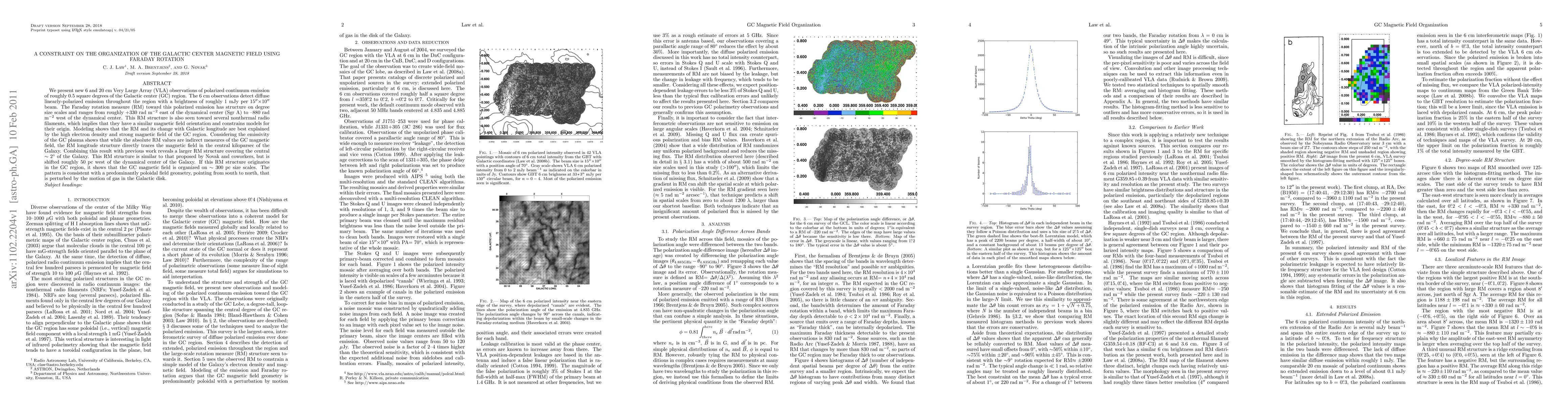 This paper uses VLA observations to measure the Faraday rotation measure (RM) in the Galactic Center region, revealing a structured RM ranging from +330 to -880 rad/m² that traces the magnetic field's orientation. The RM structure suggests the Galactic Center magnetic field is organized on ~300 pc scales, with a predominantly poloidal geometry.