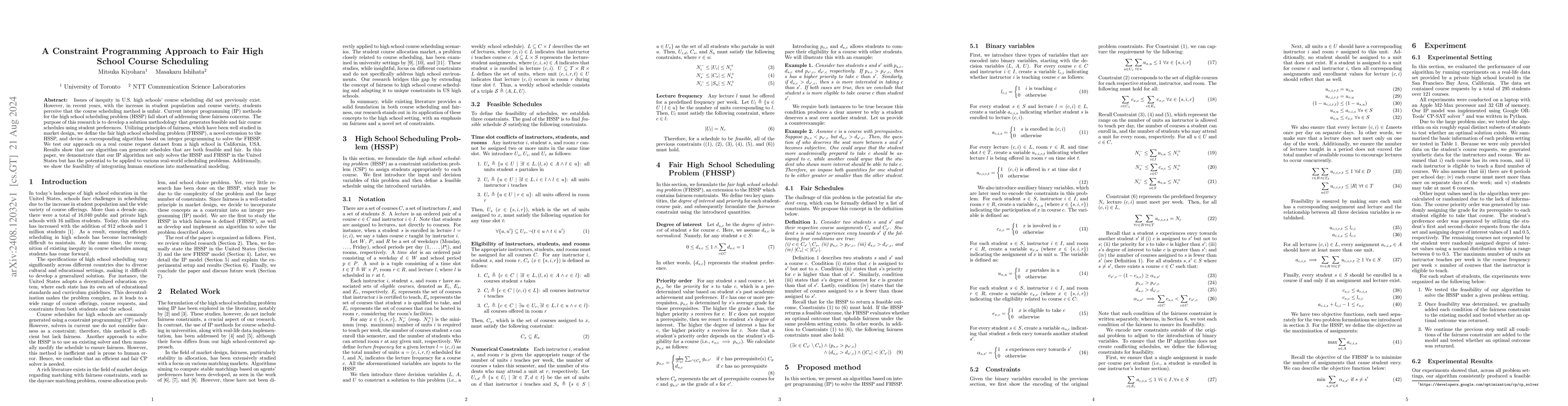This research develops a constraint programming approach to create fair high school course schedules based on student preferences, addressing perceived inequities. It introduces the fair high school scheduling problem (FHSSP) and proposes an integer programming algorithm that balances fairness and feasibility, tested on a California high school dataset with promising results.