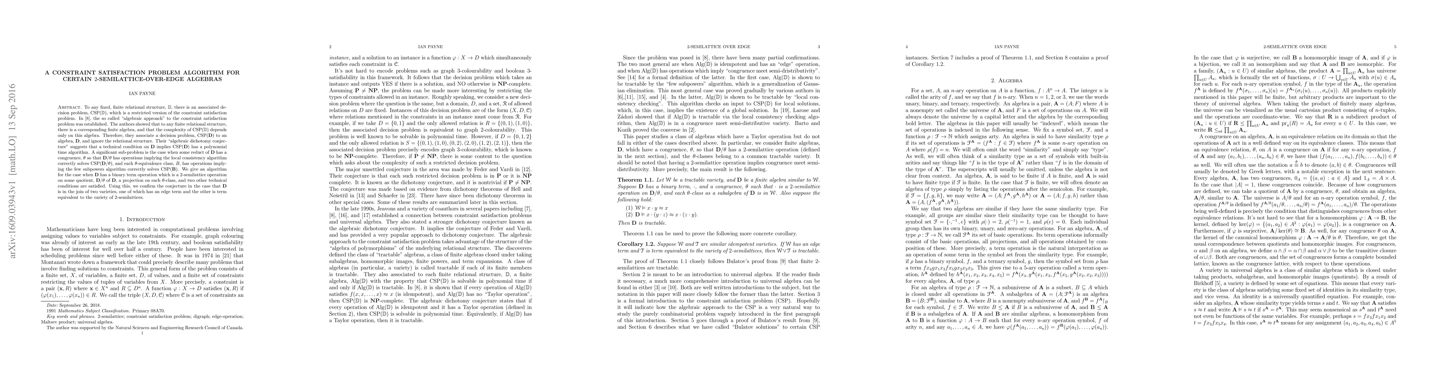 To any fixed, finite relational structure, $\mathbb{D}$, there is an associated decision problem, CSP$(\mathbb{D})$, which is a restricted version of the constraint satisfaction problem. In [8], the so called "algebraic approach" to the constraint satisfaction problem was established. The authors showed that to any finite relational structure, there is a corresponding finite algebra, and that the complexity of CSP$(\mathbb{D})$ depends only on this algebra. Therefore, they associate a decision problem, CSP$({\bf D})$ to an algebra, ${\bf D}$, and ignore the relational structure. Their "algebraic dichotomy conjecture" suggests that a technical condition on ${\bf D}$ implies CSP$({\bf D})$ has a polynomial time algorithm. A significant sub-problem is the case when some reduct of ${\bf D}$ has a congruence, $\theta$ so that ${\bf D}/\theta$ has operations implying the local consistency algorithm correctly solves CSP$({\bf D}/\theta)$, and each $\theta$-equivalence class, $B$, has operations implying the few subpowers algorithm correctly solves CSP$({\bf B})$. We give an algorithm for the case when ${\bf D}$ has a binary term operation which is a $2$-semilattice operation on some quotient, ${\bf D}/\theta$ of ${\bf D}$, a projection on each $\theta$-class, and two other technical conditions are satisfied. Using this, we confirm the conjecture in the case that ${\bf D}$ is in the join of two varieties, one of which has an edge term and the other is term equivalent to the variety of $2$-semilattices.