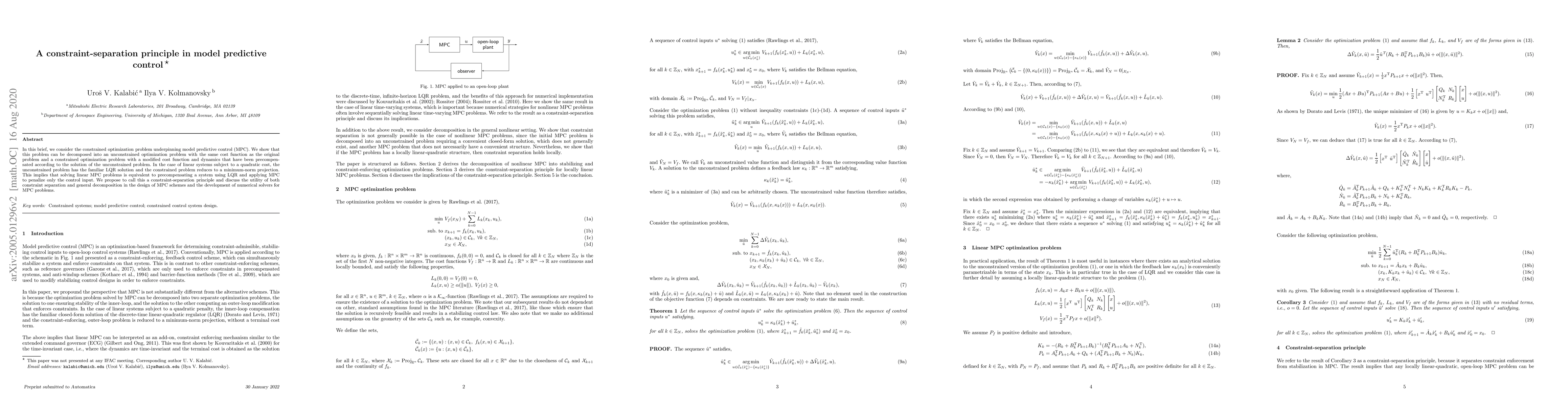 Researchers show that model predictive control can be simplified to precompensating a system with linear quadratic regulation and then penalizing only the control input, a 'constraint-separation principle'.
