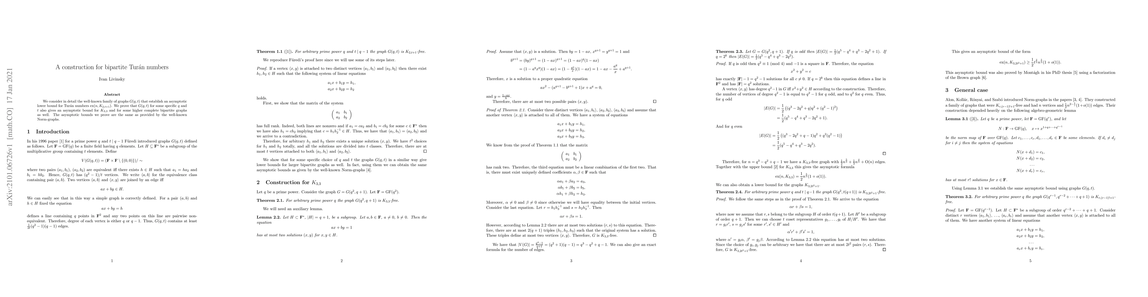 We consider in detail the well-known family of graphs $G(q,t)$ that establish an asymptotic lower bound for Tur\'an numbers $\mathrm{ex}(n,K_{2,t+1})$. We prove that $G(q,t)$ for some specific $q$ and $t$ also gives an asymptotic bound for $K_{3,3}$ and for some higher complete bipartite graphs as well. The asymptotic bounds we prove are the same as provided by the well-known Norm-graphs.