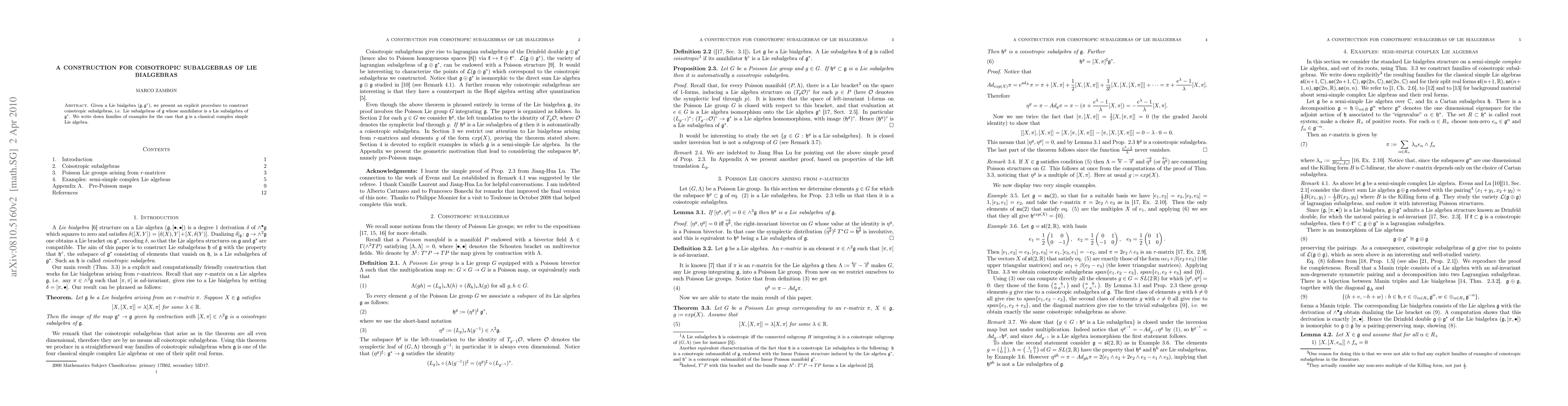 This paper presents a method for constructing coisotropic subalgebras in Lie bialgebras, specifically identifying Lie subalgebras whose annihilators are also Lie subalgebras. It provides examples when the Lie algebra is a classical complex simple Lie algebra.