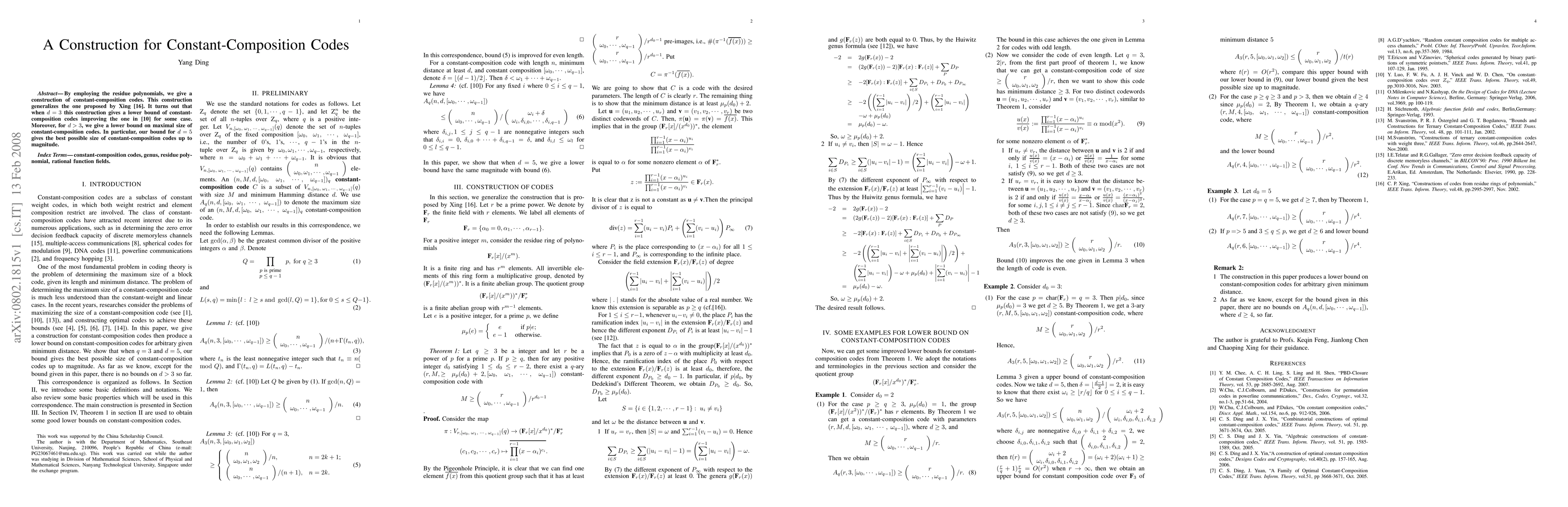 This paper constructs constant-composition codes using residue polynomials, generalizing a previous method. It provides improved lower bounds for code sizes, especially for d=3 and d=5, achieving the best possible size for d=5.