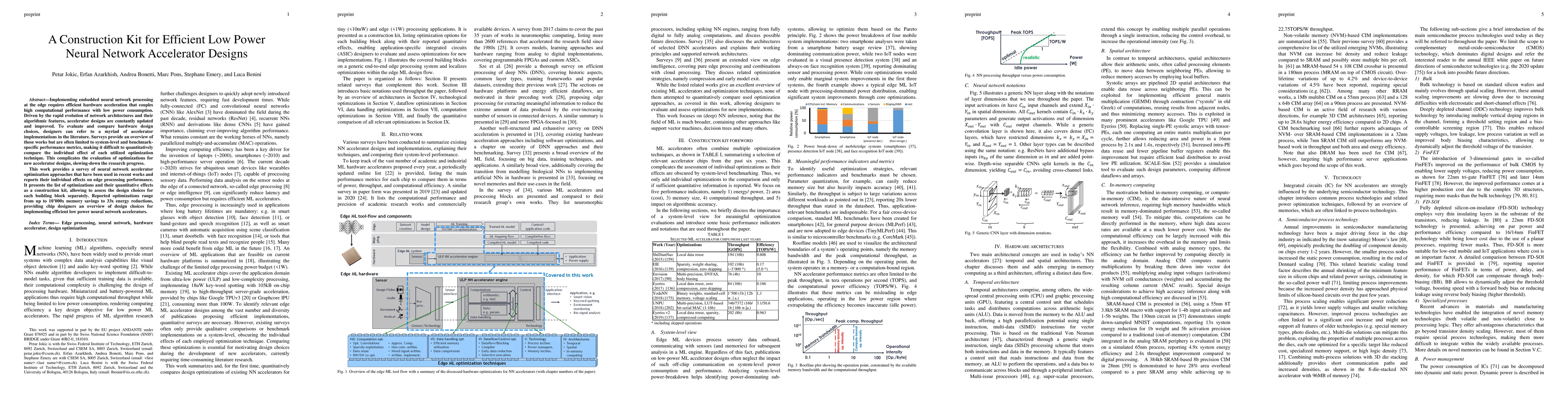 This paper surveys optimization techniques for designing efficient low power neural network accelerators, presenting a "construction kit" that quantifies individual optimization effects to aid in evaluating and selecting design choices for new accelerator designs. The reported optimizations offer significant memory savings and energy reductions, supporting rapid progress in edge processing hardware design.