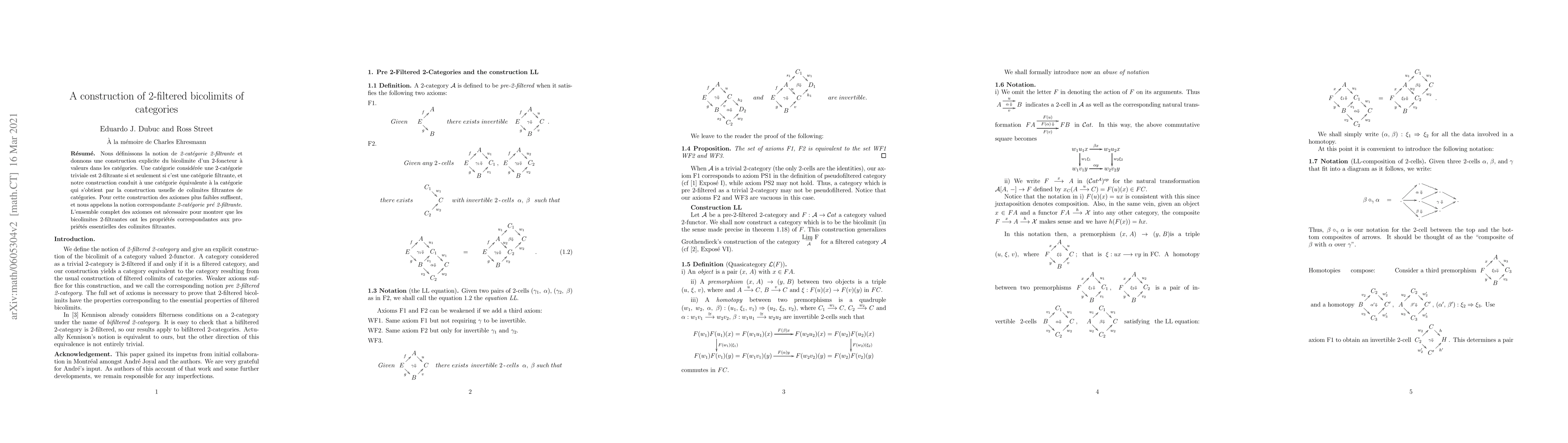 Researchers develop a construction method for 2-filtered bicolimits of categories, which are equivalent to filtered colimits under the usual axioms, offering an alternative approach with weaker conditions.