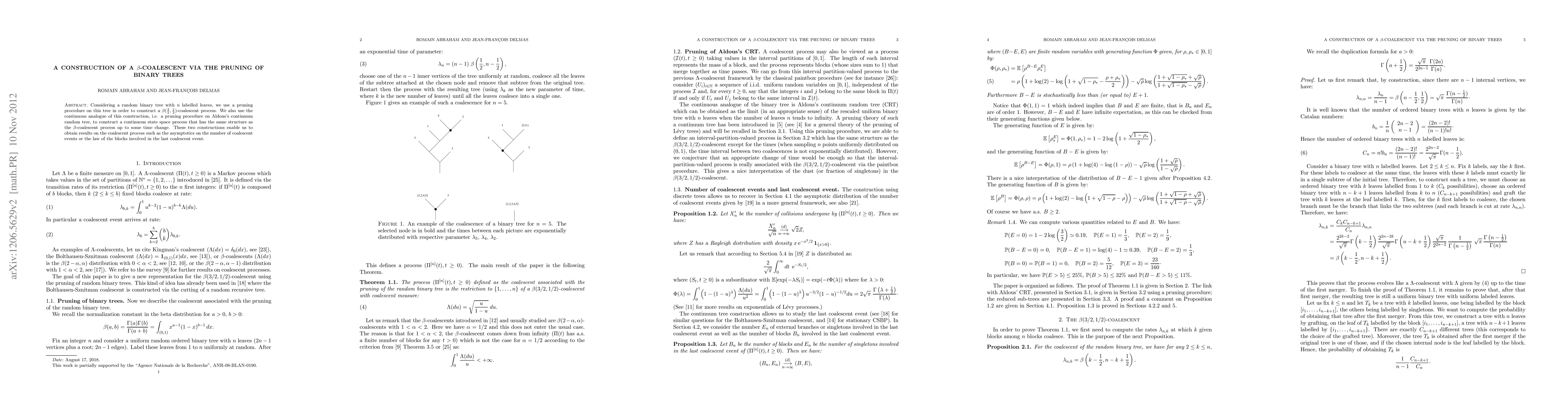 Considering a random binary tree with $n$ labelled leaves, we use a pruning procedure on this tree in order to construct a $\beta(3/2,1/2)$-coalescent process. We also use the continuous analogue of this construction, i.e. a pruning procedure on Aldous's continuum random tree, to construct a continuous state space process that has the same structure as the $\beta$-coalescent process up to some time change. These two constructions unable us to obtain results on the coalescent process such as the asymptotics on the number of coalescent events or the law of the blocks involved in the last coalescent event.