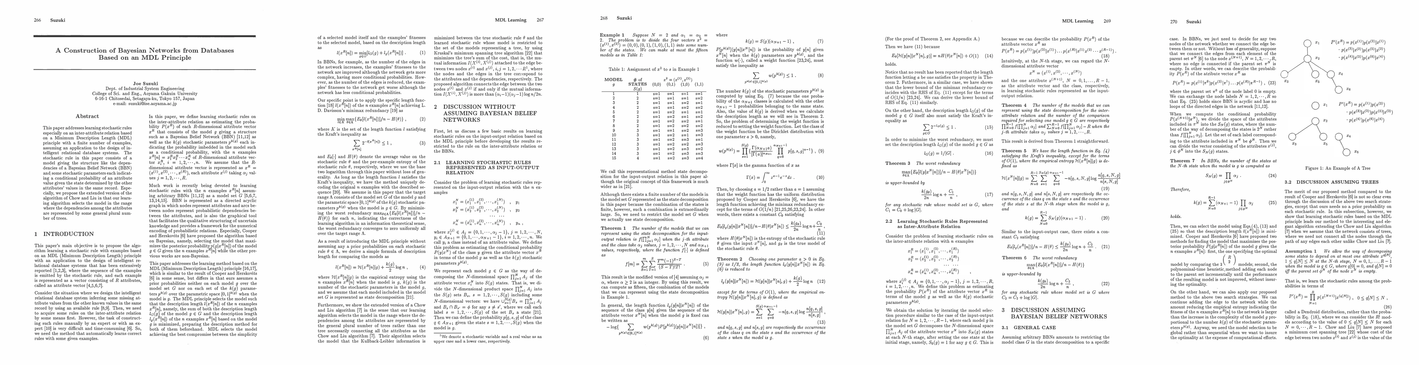 This paper proposes a method to construct Bayesian networks from databases based on Minimum Description Length (MDL) principle, enabling the design of intelligent relational database systems.