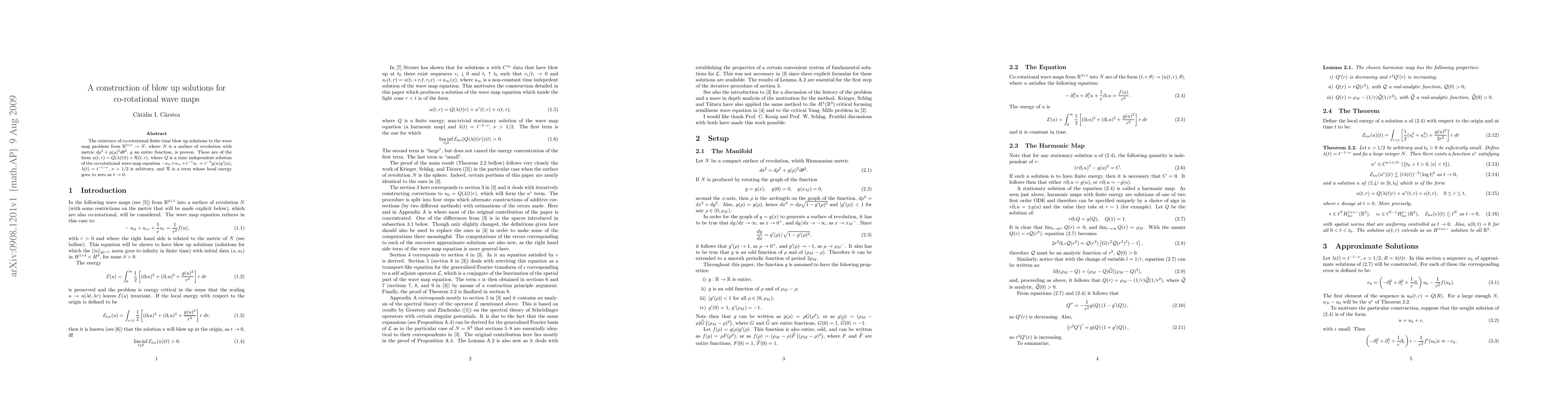 This paper proves the existence of co-rotational finite time blow up solutions for the wave map problem from R^{2+1} to a surface of revolution, showing that these solutions take the form u(t,r)=Q(\lambda(t)t)+R(t,r) with specific properties. The term R has negligible local energy as t approaches 0.