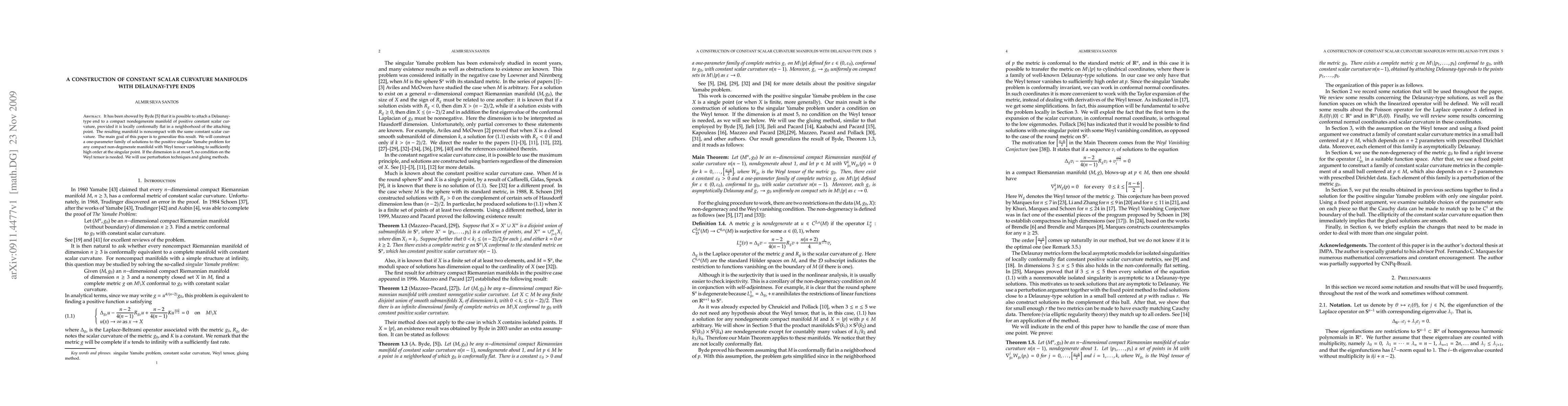 This paper generalizes Byde's construction of constant scalar curvature manifolds by attaching Delaunay-type ends, using perturbation and gluing methods to create a one-parameter family of solutions to the positive singular Yamabe problem for a wide range of dimensions.