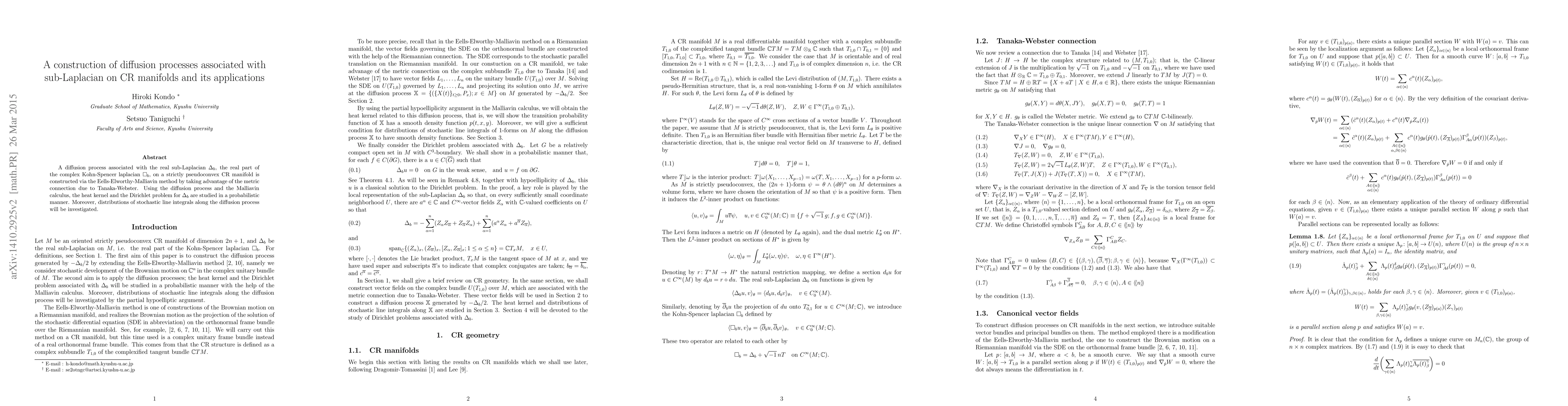 A diffusion process associated with the real sub-Laplacian $\Delta_b$, the real part of the complex Kohn-Spencer laplacian $\square_b$, on a strictly pseudoconvex CR manifold is constructed via the Eells-Elworthy-Malliavin method by taking advantage of the metric connection due to Tanaka-Webster. Using the diffusion process and the Malliavin calculus, the heat kernel and the Dirichlet problem for $\Delta_b$ are studied in a probabilistic manner. Moreover, distributions of stochastic line integrals along the diffusion process will be investigated.