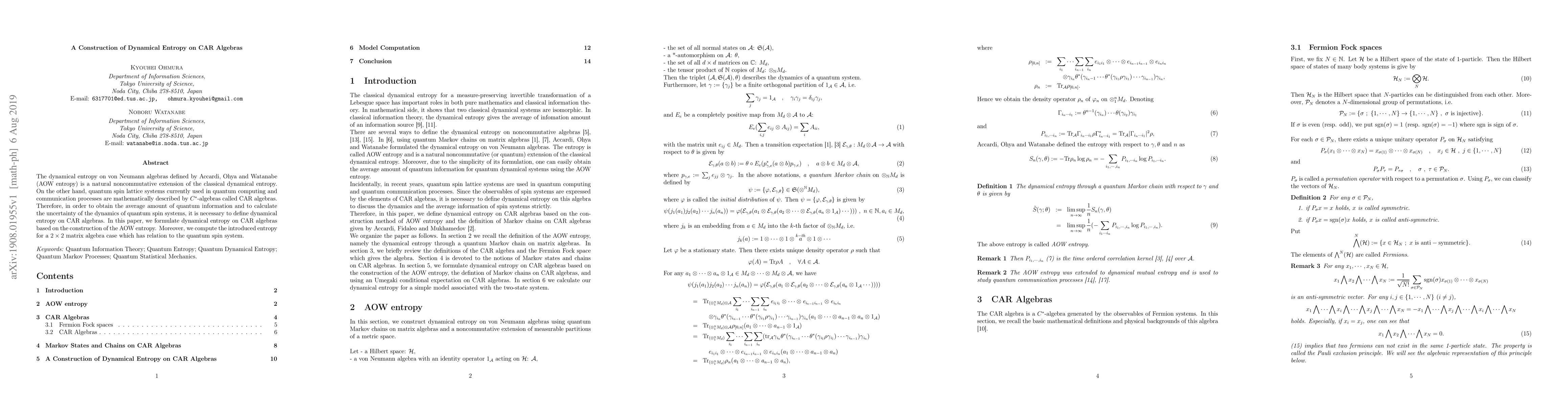 This paper constructs dynamical entropy on CAR algebras, extending the AOW entropy for noncommutative systems, and computes this entropy for a $2 \times 2$ matrix algebra relevant to quantum spin systems.