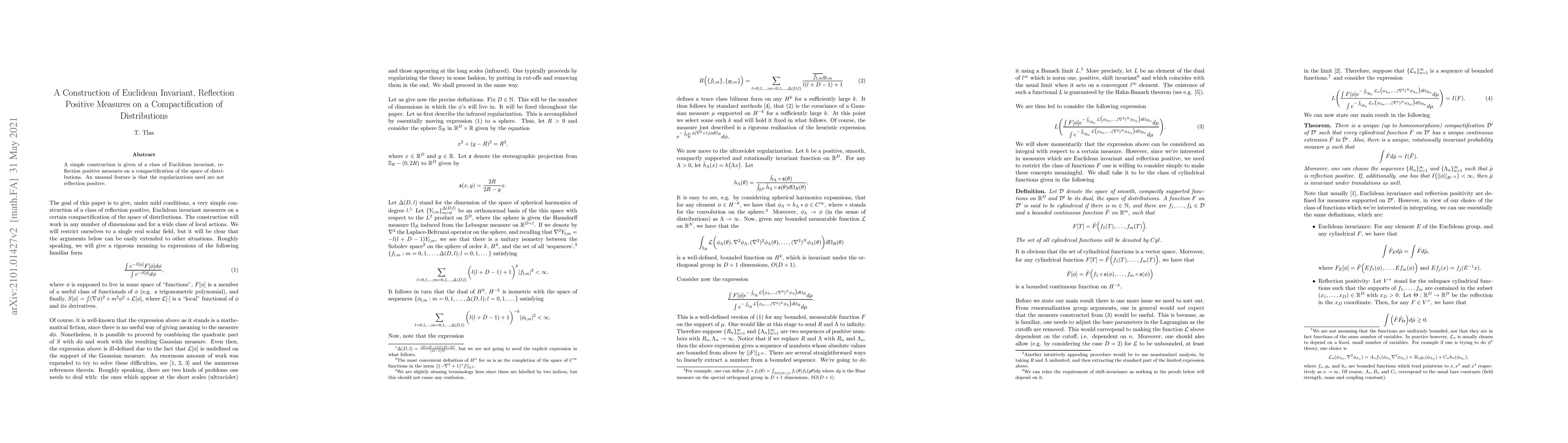 Summary: This paper constructs Euclidean invariant, reflection positive measures on a compactification of distributions, highlighting an unusual aspect where the regularizations employed are not reflection positive. The method provides a unique approach to measure construction in this context.