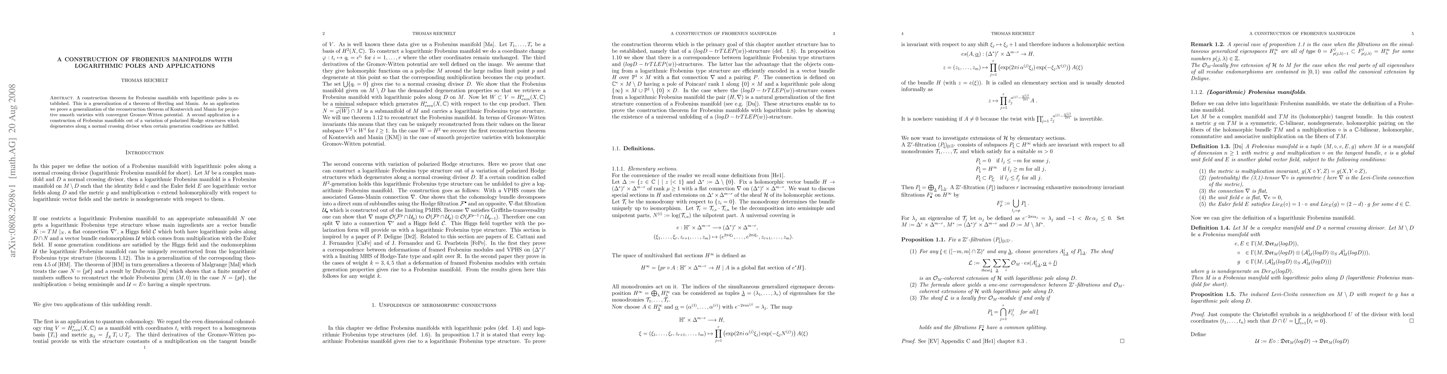 This paper constructs Frobenius manifolds with logarithmic poles, extending a previous theorem by Hertling and Manin. It applies this construction to generalize Kontsevich and Manin's reconstruction theorem for projective smooth varieties and to build Frobenius manifolds from variations of polarized Hodge structures along normal crossing divisors.