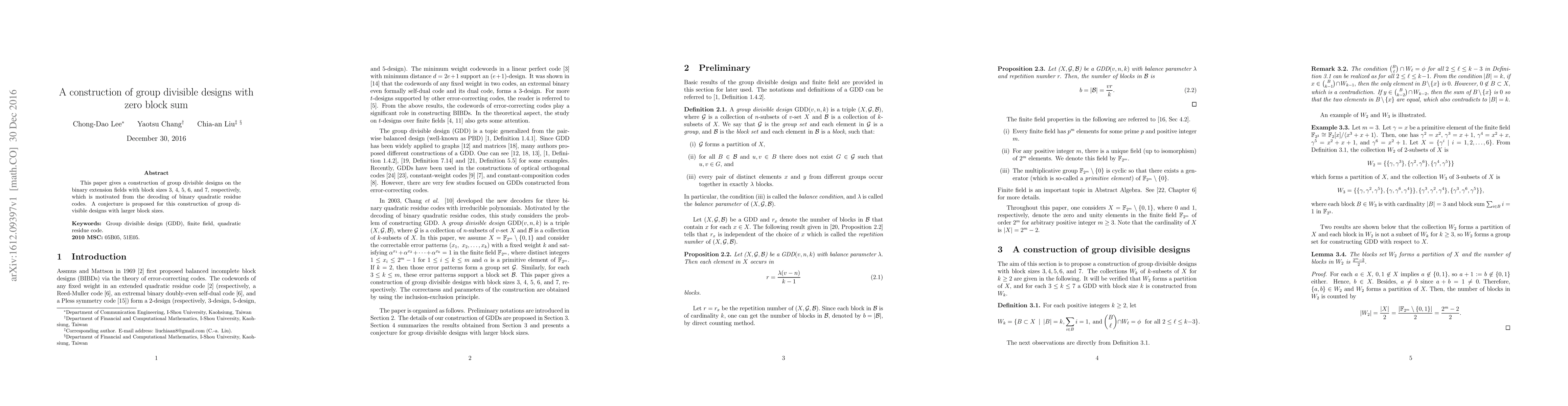 This paper gives a construction of group divisible designs on the binary extension fields with block sizes 3, 4, 5, 6, and 7, respectively, which is motivated from the decoding of binary quadratic residue codes. A conjecture is proposed for this construction of group divisible designs with larger block sizes.
