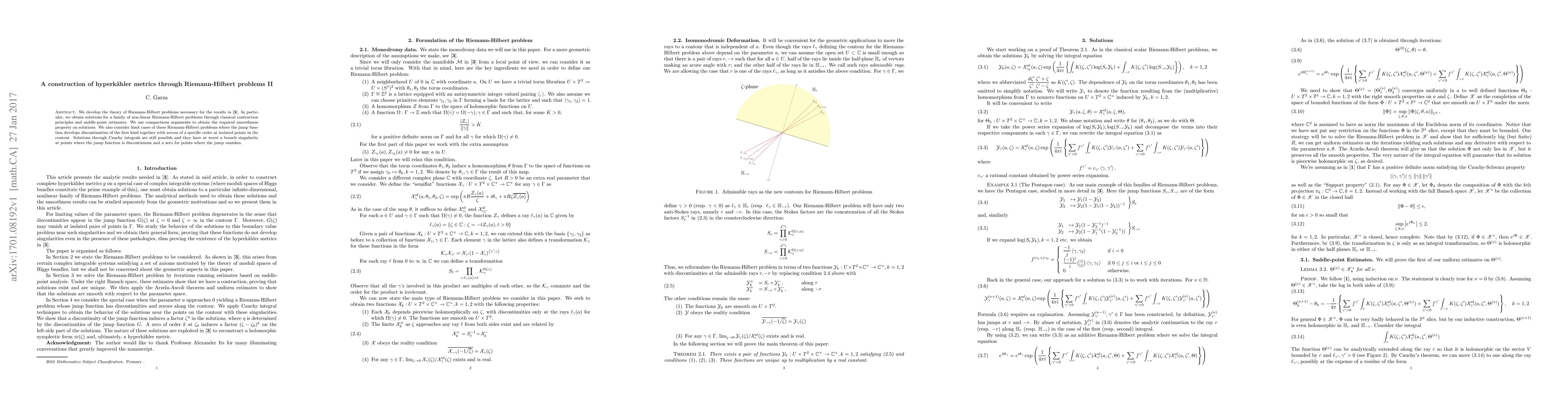 This paper develops the theory of Riemann-Hilbert problems to construct hyperkähler metrics, solving non-linear problems using classical contraction principles and saddle-point estimates. It also addresses limit cases with discontinuities and zeroes in the jump function, providing solutions via Cauchy integrals with branch singularities.