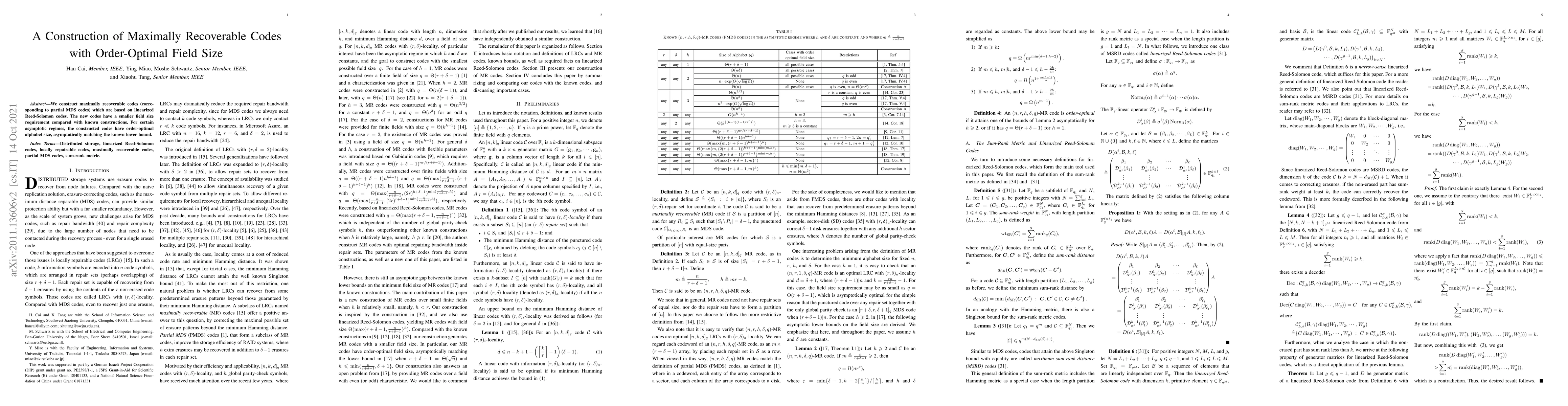 Summary: This paper constructs maximally recoverable codes based on linearized Reed-Solomon codes, achieving a smaller field size requirement than existing methods and order-optimal alphabet size for certain asymptotic regimes.