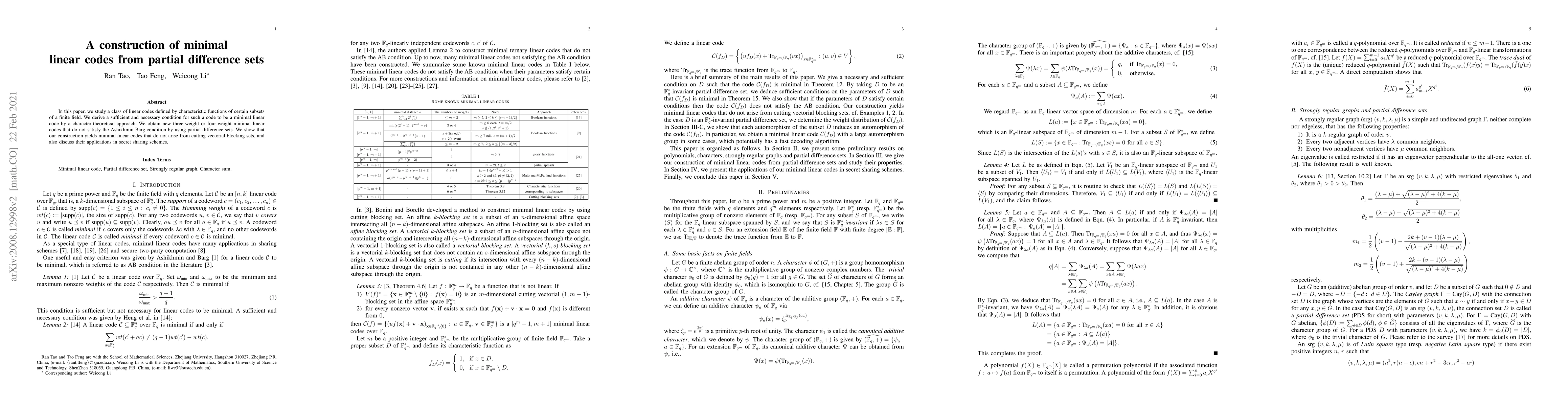 This paper constructs minimal linear codes from characteristic functions of subsets defined by partial difference sets, proving a necessary and sufficient condition for minimality via character theory. It introduces new three-weight or four-weight minimal linear codes not satisfying the Ashikhmin-Barg condition, and discusses their use in secret sharing schemes.