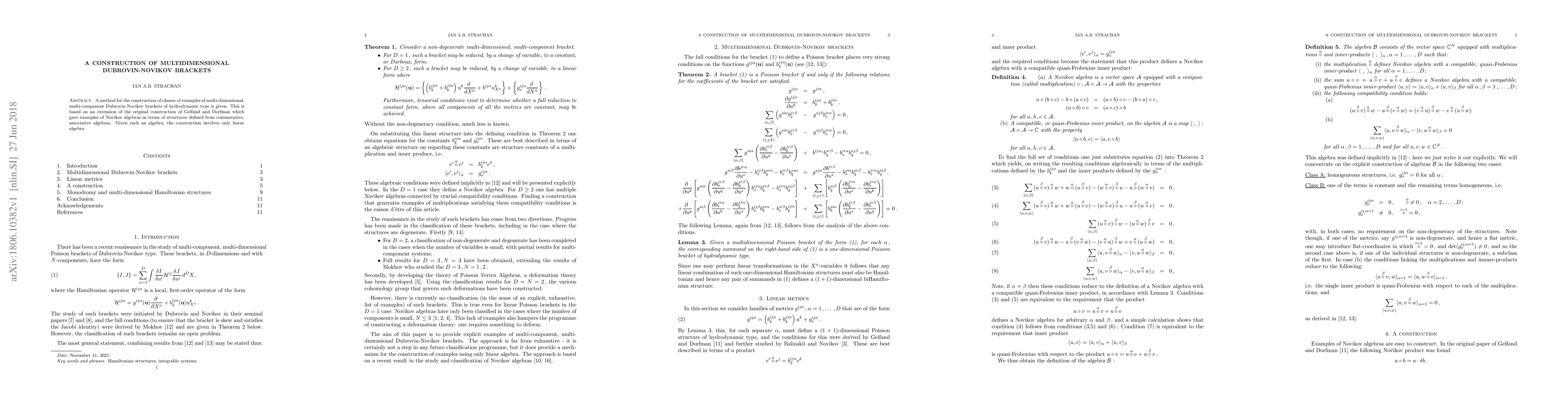 This paper presents a method to construct multi-dimensional, multi-component Dubrovin-Novikov brackets of hydrodynamic type, extending Gelfand and Dorfman's original construction of Novikov algebras based on commutative, associative algebras using linear algebra techniques.