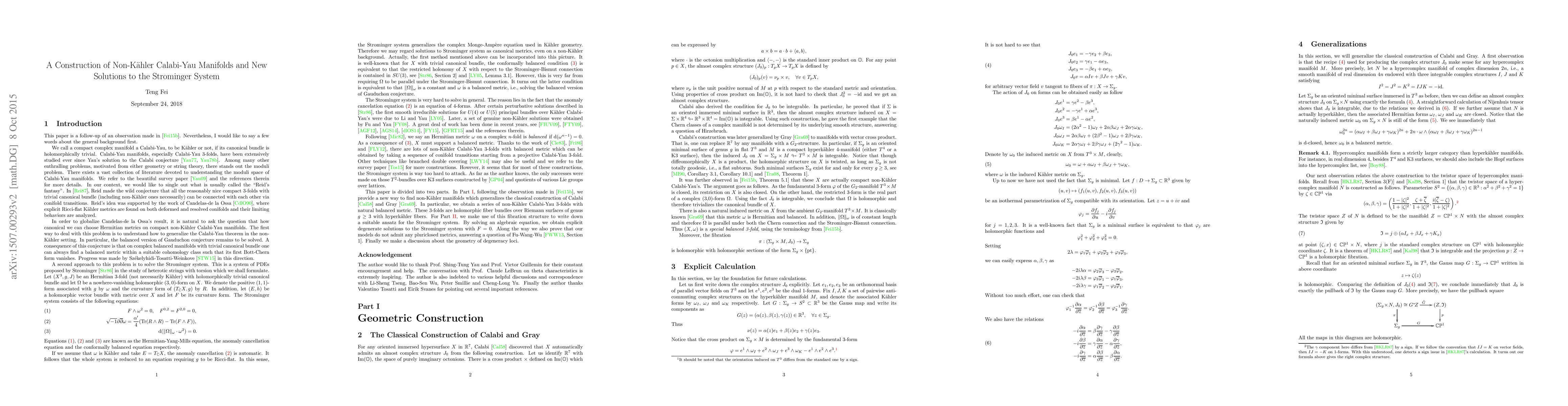 This paper constructs new compact non-Kähler Calabi-Yau manifolds with balanced metrics and finds explicit solutions to the Strominger system on these manifolds, particularly in the form of degeneracies on $\Sigma_g\times T^4$ where $\Sigma_g$ is a minimal surface in $T^3$.