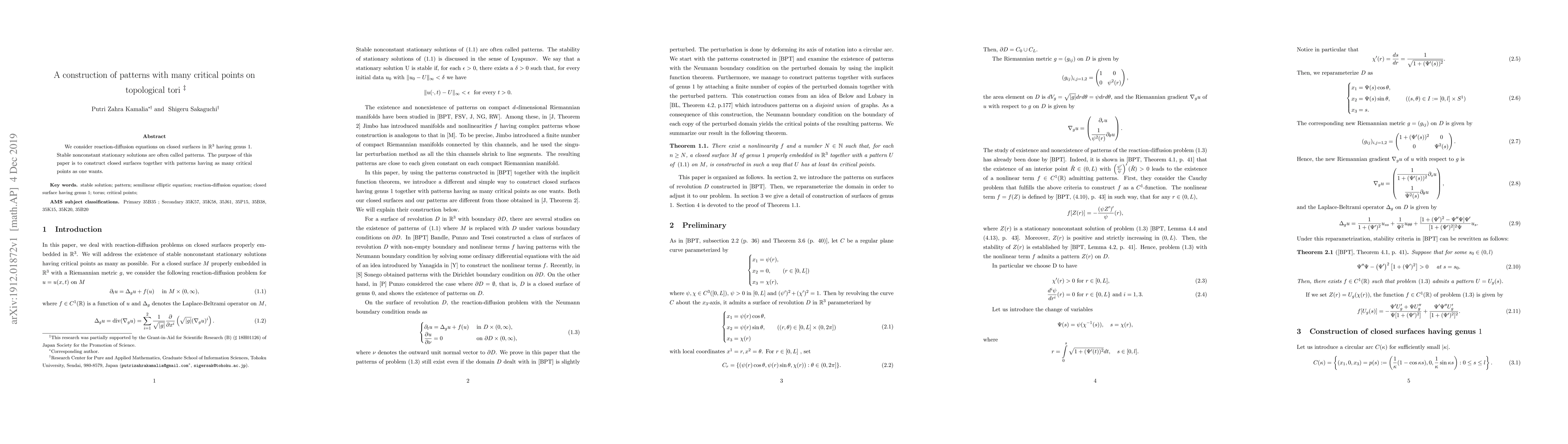 We consider reaction-diffusion equations on closed surfaces in $\mathbb R^3$ having genus $1$. Stable nonconstant stationary solutions are often called patterns. The purpose of this paper is to construct closed surfaces together with patterns having as many critical points as one wants.