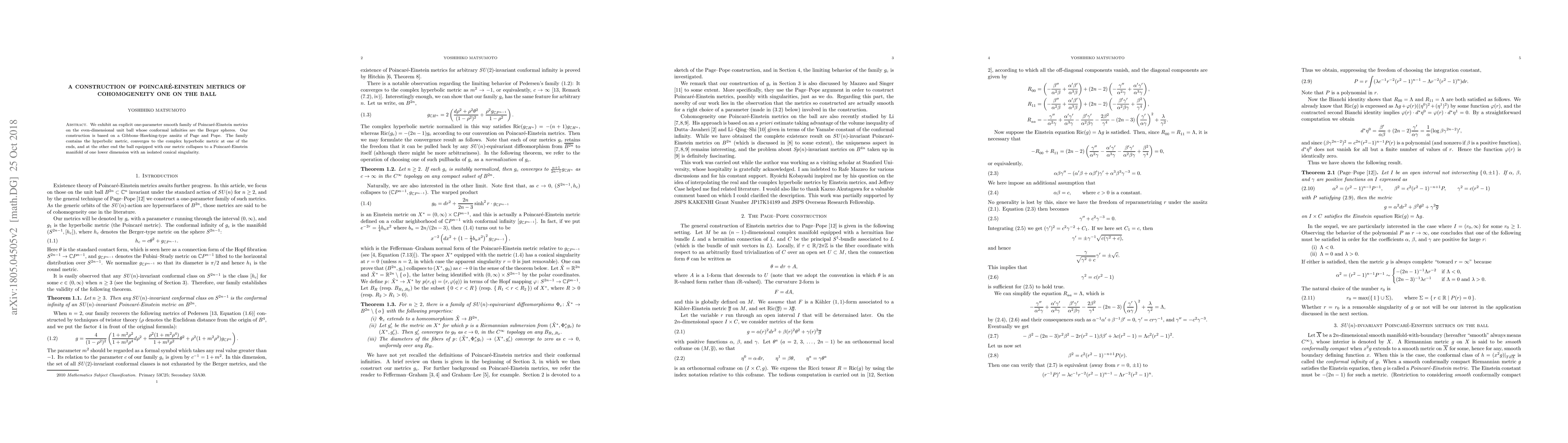 We exhibit an explicit one-parameter smooth family of Poincar\'e-Einstein metrics on the even-dimensional unit ball whose conformal infinities are the Berger spheres. Our construction is based on a Gibbons-Hawking-type ans\"atz of Page and Pope. The family contains the hyperbolic metric, converges to the complex hyperbolic metric at one of the ends, and at the other end the ball equipped with our metric collapses to a Poincar\'e-Einstein manifold of one lower dimension with an isolated conical singularity.