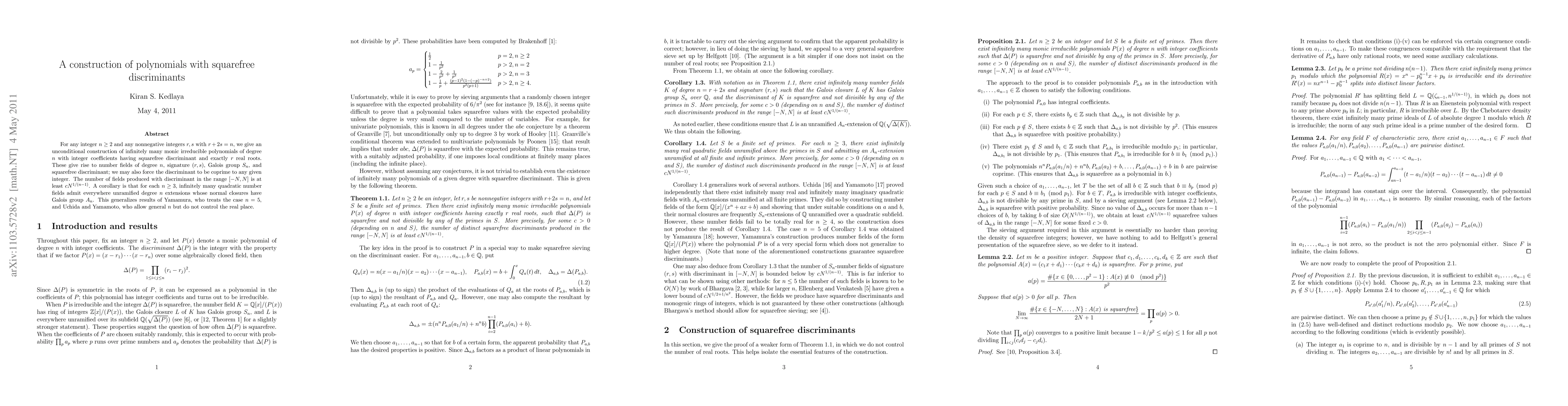 This paper provides a construction method for generating infinitely many monic irreducible polynomials with squarefree discriminants, allowing for control over the Galois group and signature of the resulting number fields.