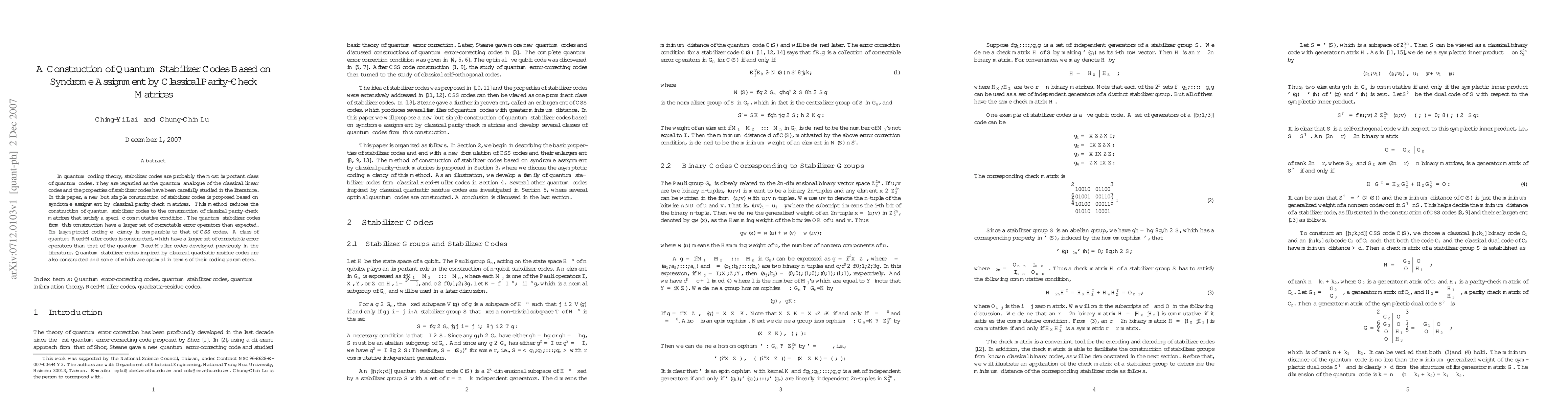 This paper proposes a new method for constructing quantum stabilizer codes based on classical parity-check matrices, achieving a larger set of correctable error operators than previous methods. The construction shows comparable coding efficiency to CSS codes and constructs improved quantum Reed-Muller codes and optimal quantum codes inspired by classical quadratic residue codes.