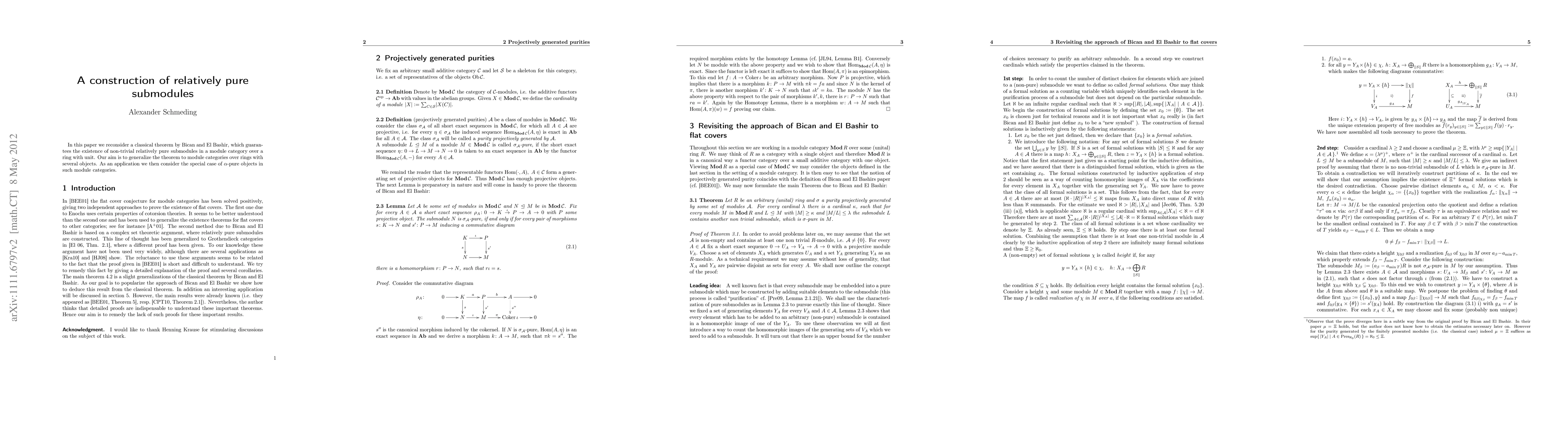 We reconsider a classical theorem by Bican and El Bashir, which guarantees the existence of non-trivial relatively pure submodules in a module category over a ring with unit. Our aim is to generalize the theorem to module categories over rings with several objects. As an application we then consider the special case of alpha-pure objects in such module categories.