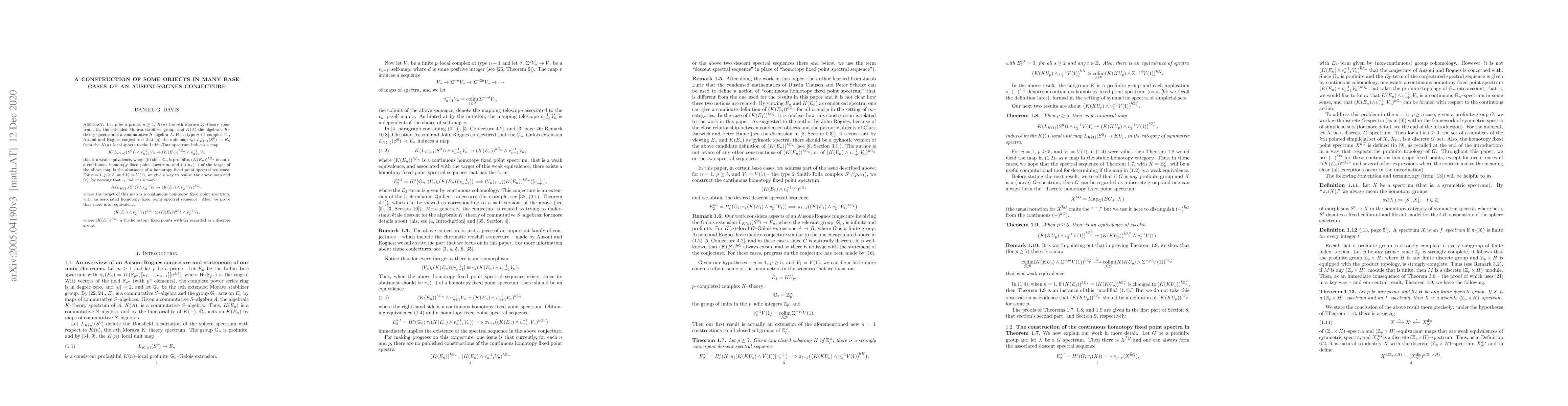 Let $p$ be a prime, $n \geq 1$, $K(n)$ the $n$th Morava $K$-theory spectrum, $\mathbb{G}_n$ the extended Morava stabilizer group, and $K(A)$ the algebraic $K$-theory spectrum of a commutative $S$-algebra $A$. For a type $n+1$ complex $V_n$, Ausoni and Rognes conjectured that (a) the unit map $i_n: L_{K(n)}(S^0) \to E_n$ from the $K(n)$-local sphere to the Lubin-Tate spectrum induces a map \[K(L_{K(n)}(S^0)) \wedge v_{n+1}^{-1}V_n \to (K(E_n))^{h\mathbb{G}_n} \wedge v_{n+1}^{-1}V_n\] that is a weak equivalence, where (b) since $\mathbb{G}_n$ is profinite, $(K(E_n))^{h\mathbb{G}_n}$ denotes a continuous homotopy fixed point spectrum, and (c) $\pi_\ast(-)$ of the target of the above map is the abutment of a homotopy fixed point spectral sequence. For $n = 1$, $p \geq 5$, and $V_1 = V(1)$, we give a way to realize the above map and (c), by proving that $i_1$ induces a map \[K(L_{K(1)}(S^0)) \wedge v_{2}^{-1}V_1 \to (K(E_1) \wedge v_{2}^{-1}V_1)^{h\mathbb{G}_1},\] where the target of this map is a continuous homotopy fixed point spectrum, with an associated homotopy fixed point spectral sequence. Also, we prove that there is an equivalence \[(K(E_1) \wedge v_{2}^{-1}V_1)^{h\mathbb{G}_1} \simeq (K(E_1))^{\widetilde{h}\mathbb{G}_1} \wedge v_2^{-1}V_1,\] where $(K(E_1))^{\widetilde{h}\mathbb{G}_1}$ is the homotopy fixed points with $\mathbb{G}_1$ regarded as a discrete group.